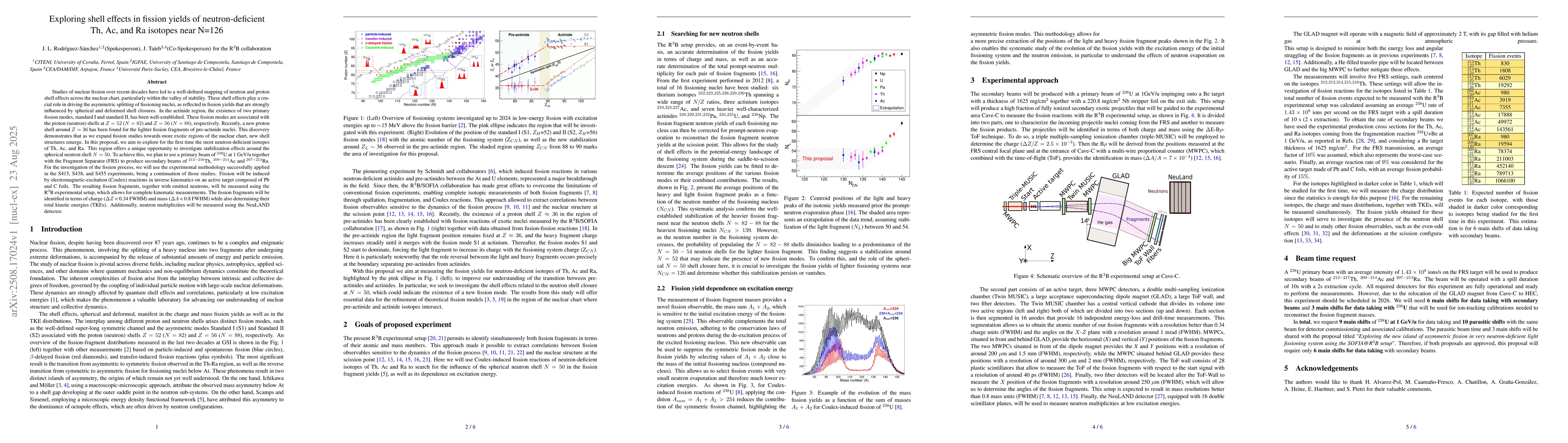 Studies of nuclear fission over recent decades have led to a well-defined mapping of neutron and proton shell effects across the nuclear chart, particularly within the valley of stability. These shell effects play a crucial role in driving the asymmetric splitting of fissioning nuclei, as reflected in fission yields that are strongly influenced by spherical and deformed shell closures. In the actinide region, the existence of two primary fission modes, standard I and standard II, has been well-established. These fission modes are associated with the proton (neutron) shells at $Z=52$ ($N=82$) and $Z=56$ ($N=88$), respectively. Recently, a new proton shell around $Z=36$ has been found for the lighter fission fragments of pre-actinide nuclei. This discovery demonstrates that as we expand fission studies towards more exotic regions of the nuclear chart, new shell structures emerge. In this proposal, we aim to explore for the first time the most neutron-deficient isotopes of Th, Ac, and Ra. This region offers a unique opportunity to investigate stabilization effects around the spherical neutron shell $N=50$. To achieve this, we plan to use a primary beam of $^{238}$U at 1~GeV/u together with the Fragment Separator (FRS) to produce secondary beams of $^{213-216}$Th, $^{209-214}$Ac and $^{207-213}$Ra. For the investigation of the fission process, we will use the experimental methodology successfully applied in the S415, S438, and S455 experiments, being a continuation of those studies. Fission will be induced by electromagnetic-excitation (Coulex) reactions in inverse kinematics on an active target composed of Pb and C foils. The resulting fission fragments, together with emitted neutrons, will be measured using the R$^3$B experimental setup, which allows for complete kinematic measurements.
