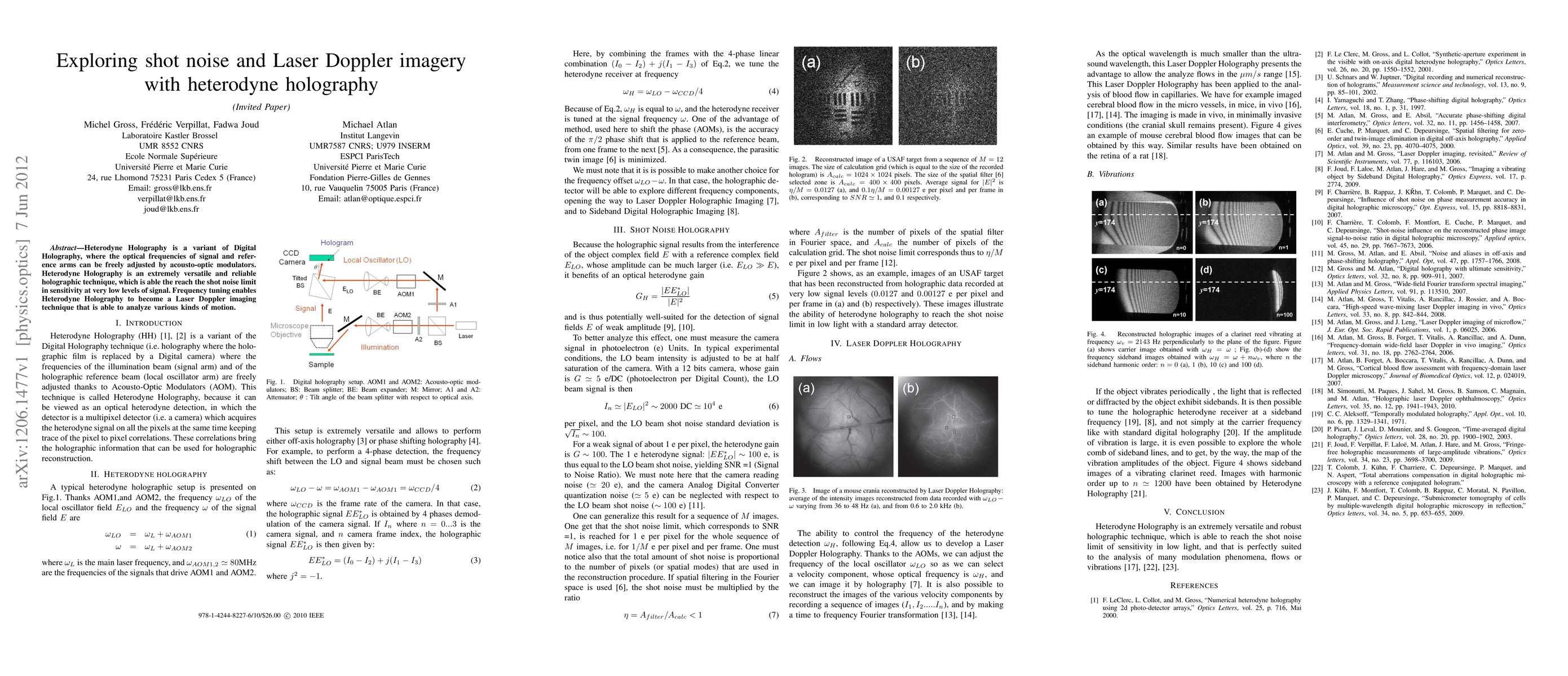 Summary: Heterodyne Holography, a flexible variant of Digital Holography, adjusts optical frequencies with acousto-optic modulators, achieving shot noise sensitivity and low signal levels. It also functions as a Laser Doppler imaging technique for analyzing diverse motion types through frequency tuning.