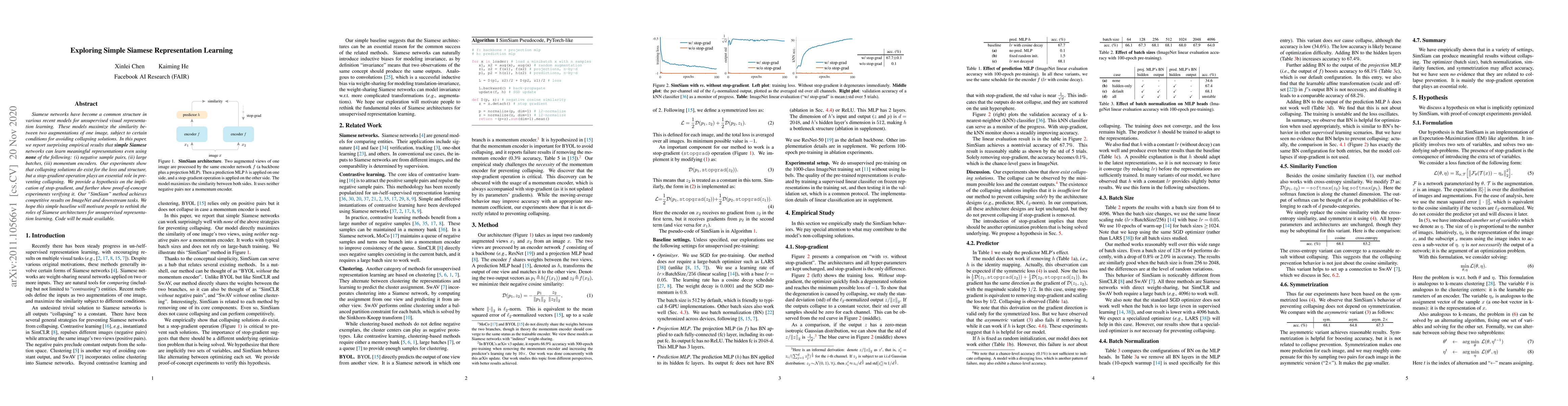 Siamese networks have become a common structure in various recent models for unsupervised visual representation learning. These models maximize the similarity between two augmentations of one image, subject to certain conditions for avoiding collapsing solutions. In this paper, we report surprising empirical results that simple Siamese networks can learn meaningful representations even using none of the following: (i) negative sample pairs, (ii) large batches, (iii) momentum encoders. Our experiments show that collapsing solutions do exist for the loss and structure, but a stop-gradient operation plays an essential role in preventing collapsing. We provide a hypothesis on the implication of stop-gradient, and further show proof-of-concept experiments verifying it. Our "SimSiam" method achieves competitive results on ImageNet and downstream tasks. We hope this simple baseline will motivate people to rethink the roles of Siamese architectures for unsupervised representation learning. Code will be made available.
