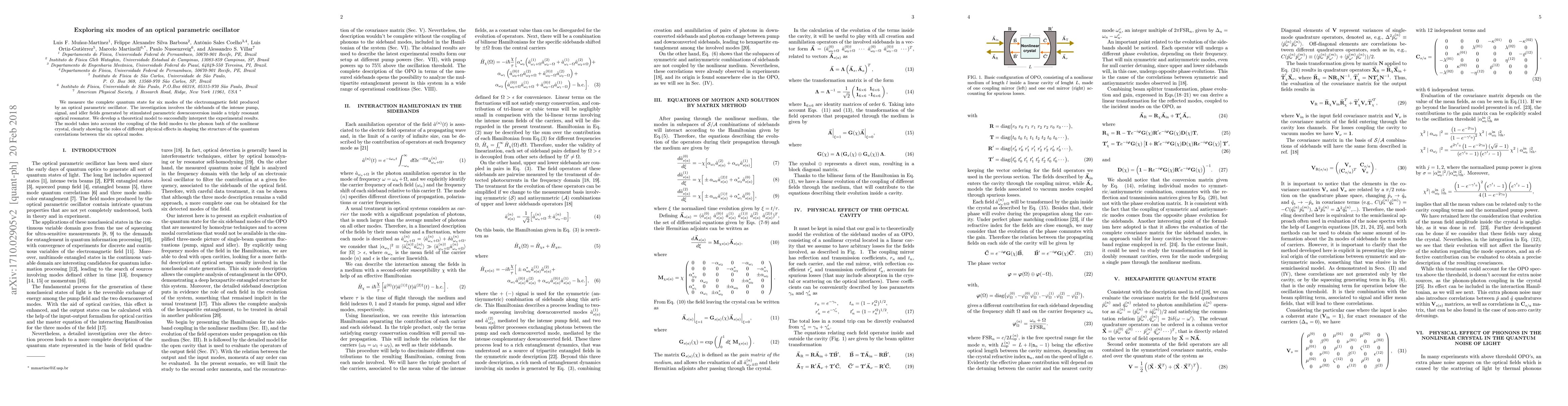 This research measures the quantum state of six modes from an optical parametric oscillator, analyzing the sidebands of pump, signal, and idler fields. A theoretical model is developed to interpret the quantum correlations, highlighting the influence of physical effects like phonon bath coupling on the field modes.