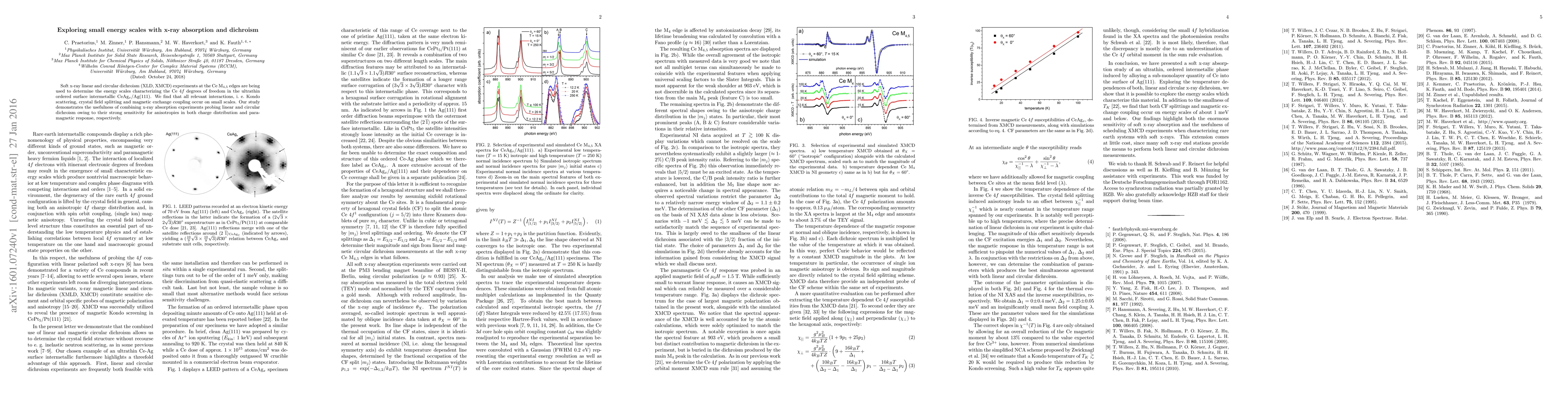 Soft x-ray linear and circular dichroism (XLD, XMCD) experiments at the Ce M$_{4,5}$ edges are being used to determine the energy scales characterizing the Ce $4f$ degrees of freedom in the ultrathin ordered surface intermetallic CeAg$_x$/Ag(111). We find that all relevant interactions, i. e. Kondo scattering, crystal field splitting and magnetic exchange coupling occur on small scales. Our study demonstrates the usefulness of combining x-ray absorption experiments probing linear and circular dichroism owing to their strong sensitivity for anisotropies in both charge distribution and paramagnetic response, respectively.