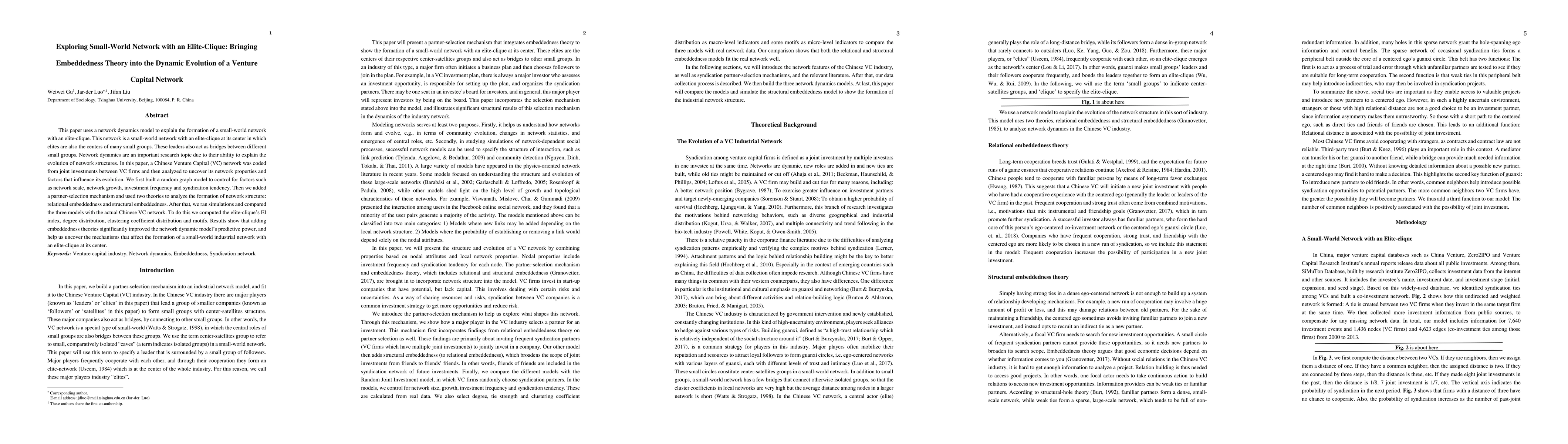 This paper uses a network dynamics model to explain the formation of a small-world network with an elite-clique. This network is a small-world network with an elite-clique at its center in which elites are also the centers of many small groups. These leaders also act as bridges between different small groups. Network dynamics are an important research topic due to their ability to explain the evolution of network structures. In this paper, a Chinese Venture Capital (VC) network was coded from joint investments between VC firms and then analyzed to uncover its network properties and factors that influence its evolution. We first built a random graph model to control for factors such as network scale, network growth, investment frequency and syndication tendency. Then we added a partner-selection mechanism and used two theories to analyze the formation of network structure: relational embeddedness and structural embeddedness. After that, we ran simulations and compared the three models with the actual Chinese VC network. To do this we computed the elite-clique's EI index, degree distribution, clustering coefficient distribution and motifs. Results show that adding embeddedness theories significantly improved the network dynamic model's predictive power, and help us uncover the mechanisms that affect the formation of a small-world industrial network with an elite-clique at its center.