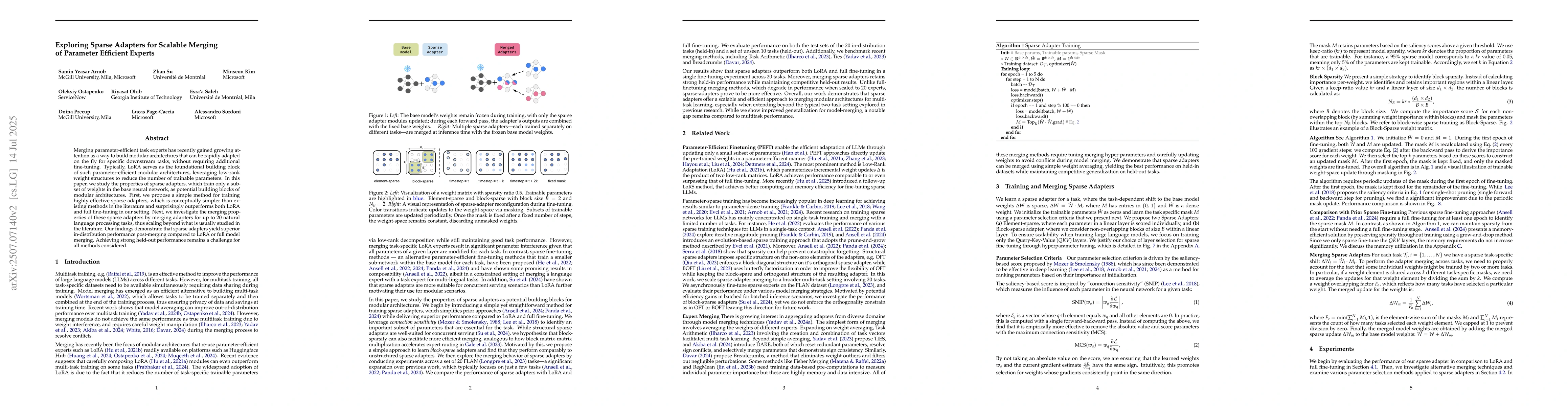 This paper explores sparse adapters, a method training only a subset of weights in base neural networks, as building blocks for modular architectures. The research proposes a simple training method for effective sparse adapters, outperforming LoRA and full fine-tuning. The study also demonstrates superior in-distribution performance of sparse adapters compared to LoRA or full model merging when merging adapters for multiple tasks, though held-out performance remains challenging for all methods.