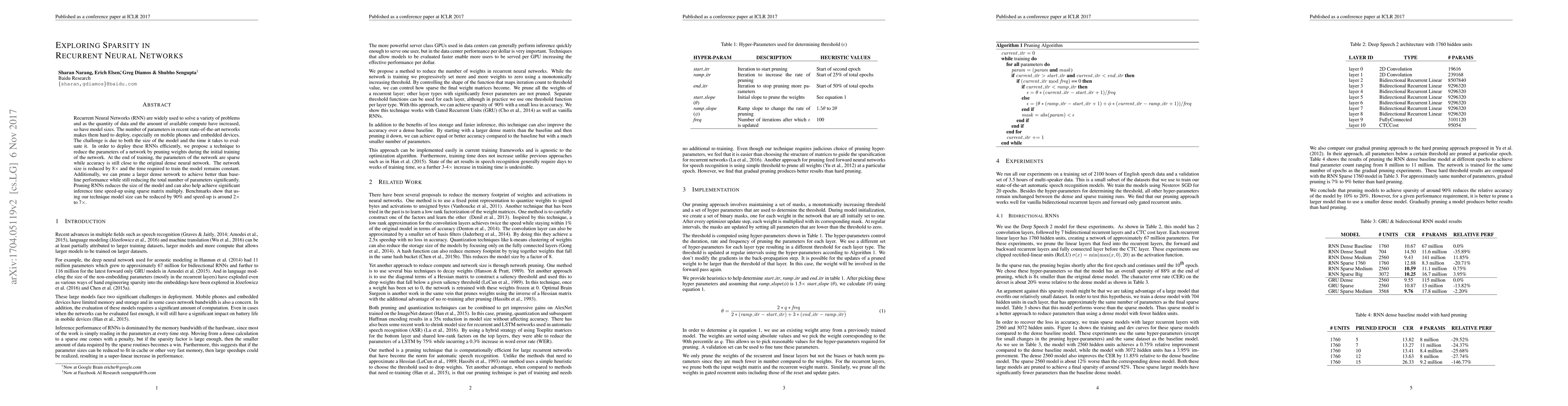 Researchers propose a technique to reduce the size of Recurrent Neural Networks by pruning weights during training, resulting in 90% reduction in model size and 2-7x speed-up in inference time.