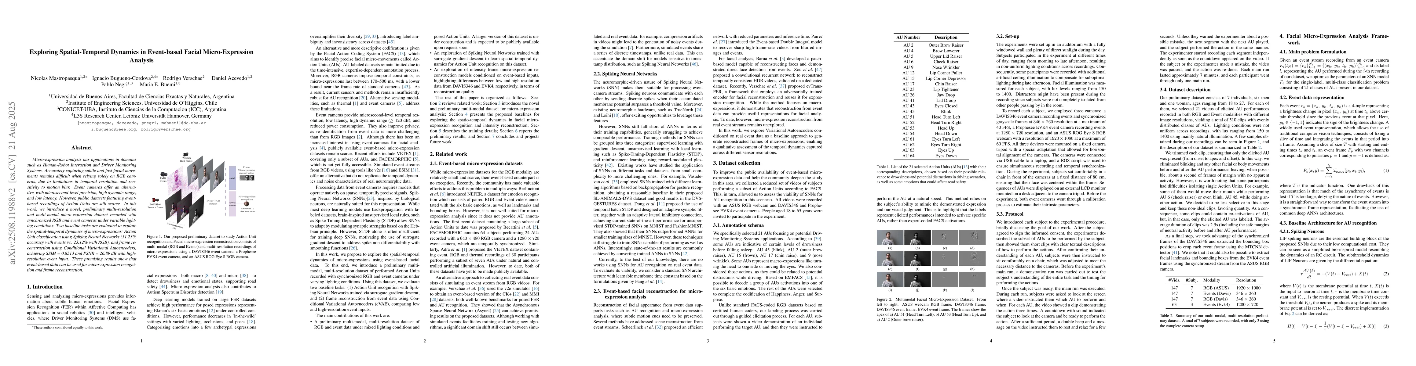 Micro-expression analysis has applications in domains such as Human-Robot Interaction and Driver Monitoring Systems. Accurately capturing subtle and fast facial movements remains difficult when relying solely on RGB cameras, due to limitations in temporal resolution and sensitivity to motion blur. Event cameras offer an alternative, with microsecond-level precision, high dynamic range, and low latency. However, public datasets featuring event-based recordings of Action Units are still scarce. In this work, we introduce a novel, preliminary multi-resolution and multi-modal micro-expression dataset recorded with synchronized RGB and event cameras under variable lighting conditions. Two baseline tasks are evaluated to explore the spatial-temporal dynamics of micro-expressions: Action Unit classification using Spiking Neural Networks (51.23\% accuracy with events vs. 23.12\% with RGB), and frame reconstruction using Conditional Variational Autoencoders, achieving SSIM = 0.8513 and PSNR = 26.89 dB with high-resolution event input. These promising results show that event-based data can be used for micro-expression recognition and frame reconstruction.