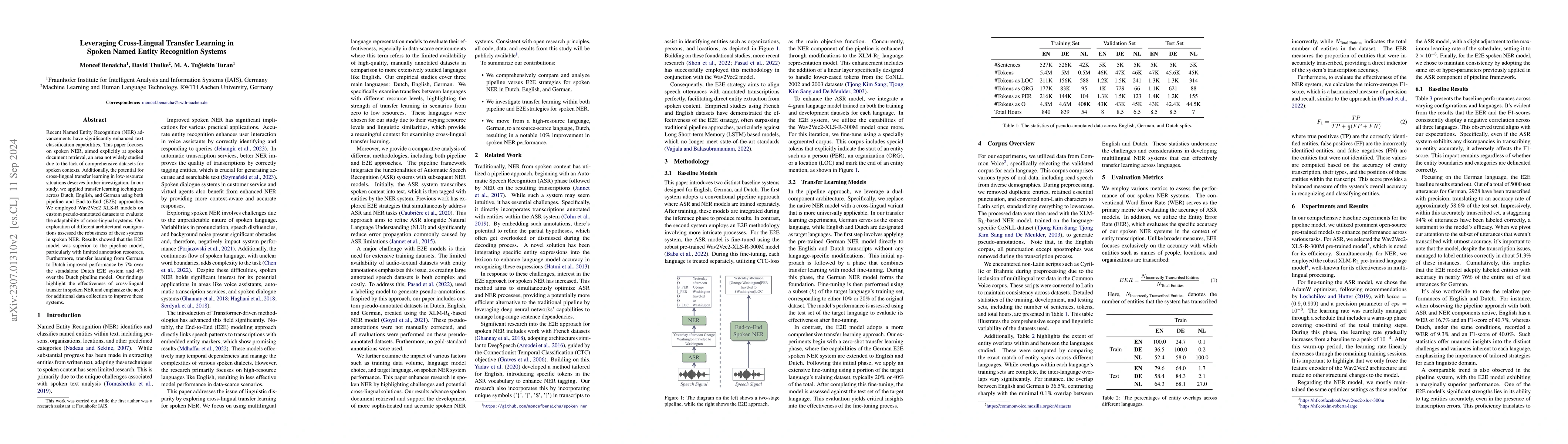 Recent advancements in Named Entity Recognition (NER) have significantly improved the identification of entities in textual data. However, spoken NER, a specialized field of spoken document retrieval, lags behind due to its limited research and scarce datasets. Moreover, cross-lingual transfer learning in spoken NER has remained unexplored. This paper utilizes transfer learning across Dutch, English, and German using pipeline and End-to-End (E2E) schemes. We employ Wav2Vec2-XLS-R models on custom pseudo-annotated datasets and investigate several architectures for the adaptability of cross-lingual systems. Our results demonstrate that End-to-End spoken NER outperforms pipeline-based alternatives over our limited annotations. Notably, transfer learning from German to Dutch surpasses the Dutch E2E system by 7% and the Dutch pipeline system by 4%. This study not only underscores the feasibility of transfer learning in spoken NER but also sets promising outcomes for future evaluations, hinting at the need for comprehensive data collection to augment the results.