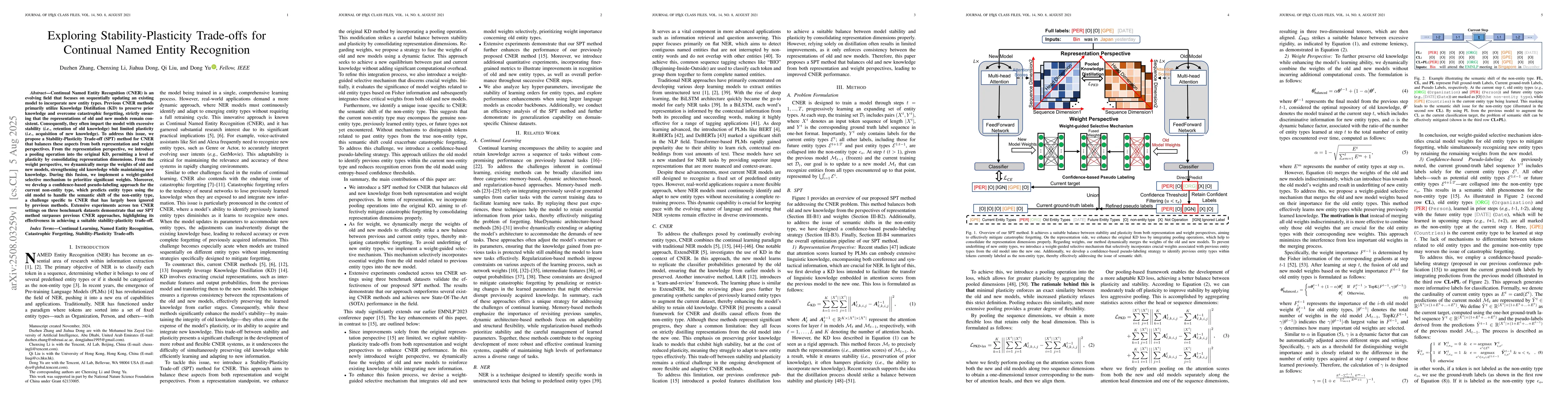 Continual Named Entity Recognition (CNER) is an evolving field that focuses on sequentially updating an existing model to incorporate new entity types. Previous CNER methods primarily utilize Knowledge Distillation (KD) to preserve prior knowledge and overcome catastrophic forgetting, strictly ensuring that the representations of old and new models remain consistent. Consequently, they often impart the model with excessive stability (i.e., retention of old knowledge) but limited plasticity (i.e., acquisition of new knowledge). To address this issue, we propose a Stability-Plasticity Trade-off (SPT) method for CNER that balances these aspects from both representation and weight perspectives. From the representation perspective, we introduce a pooling operation into the original KD, permitting a level of plasticity by consolidating representation dimensions. From the weight perspective, we dynamically merge the weights of old and new models, strengthening old knowledge while maintaining new knowledge. During this fusion, we implement a weight-guided selective mechanism to prioritize significant weights. Moreover, we develop a confidence-based pseudo-labeling approach for the current non-entity type, which predicts entity types using the old model to handle the semantic shift of the non-entity type, a challenge specific to CNER that has largely been ignored by previous methods. Extensive experiments across ten CNER settings on three benchmark datasets demonstrate that our SPT method surpasses previous CNER approaches, highlighting its effectiveness in achieving a suitable stability-plasticity trade-off.