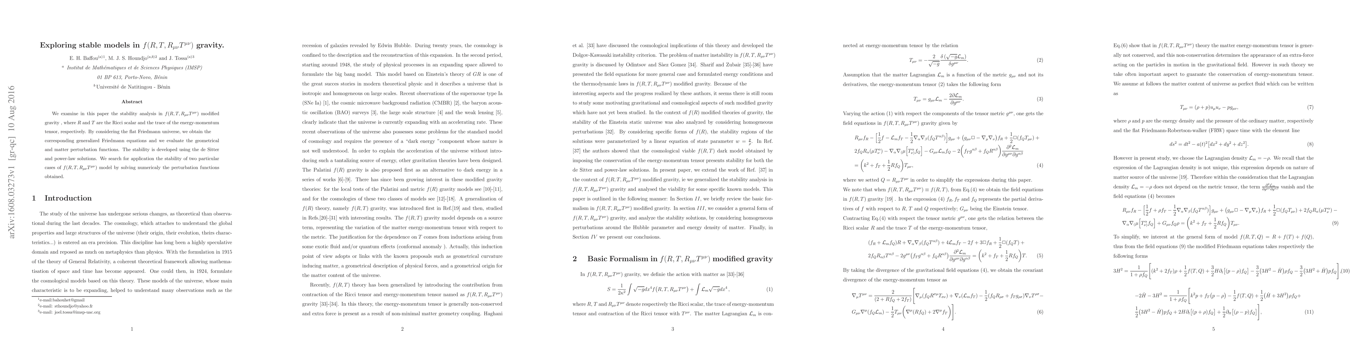 This paper investigates the stability of $f(R; T; R_{\mu\nu} T^{\mu\nu})$ modified gravity, deriving generalized Friedmann equations for a flat universe and analyzing geometrical and matter perturbations. Stability is assessed through de Sitter and power-law solutions, with numerical solutions for specific model cases.