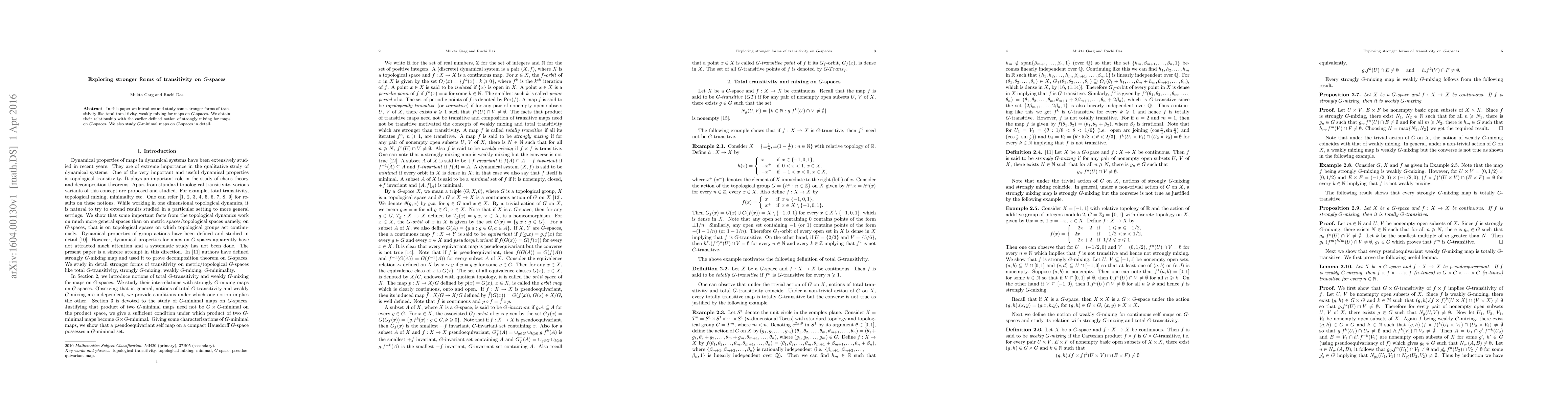 This paper investigates enhanced transitivity concepts such as total transitivity and weakly mixing for maps on G-spaces, exploring their connections to strongly mixing maps and providing a detailed examination of G-minimal maps.