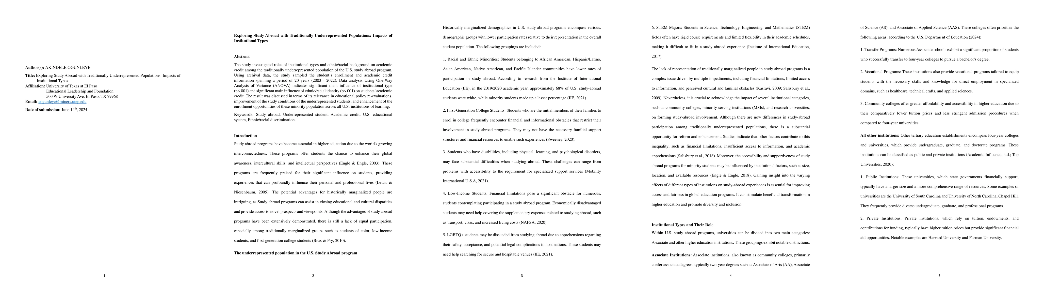 This study analyzes the impact of institutional type and ethnic/racial background on academic credit earned by traditionally underrepresented students in U.S. study abroad programs. Findings from archival data spanning 2003-2022 using ANOVA reveal significant influences of both factors, suggesting implications for educational policy and minority enrollment improvements.