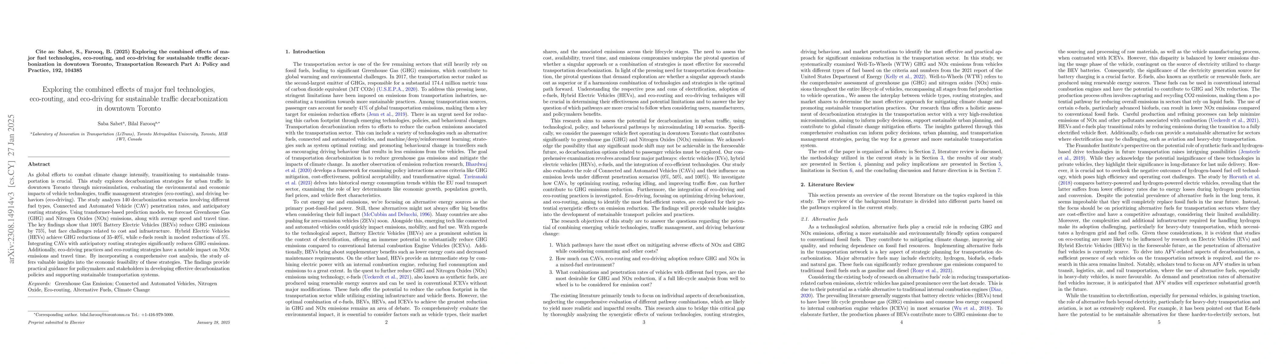 The global fight against climate change and air pollution prioritizes the transition to sustainable transportation options. Understanding the impacts of various sustainable pathways on emissions, travel time, and costs is crucial for researchers and policymakers. This research conducts a comprehensive microsimulation of traffic and emissions in downtown Toronto, Canada, to examine decarbonization scenarios. The resulting 140 scenarios involve different fuel types, Connected and Automated Vehicles (CAV) penetration rates, and routing strategies combined with driving style. To achieve this, transformers-based prediction models accurately forecast Greenhouse Gas (GHG) and Nitrogen Oxides (NOx) emissions and average speed for eco-routing. The study finds that 100% battery electric vehicles have the lowest GHG emissions, showing their potential as a sustainable transportation solution. However, challenges related to cost and availability persist. Hybrid Electric Vehicles and e-fuels demonstrate considerable emission reductions, emerging as promising alternatives. Integrating CAVs with anticipatory routing strategies significantly reduces GHG emissions. Additionally, eco-driving practices and eco-routing strategies have a notable impact on NOx emissions and travel time. Comprehensive cost analysis provides valuable insights into the economic implications of various strategies and technologies. These findings offer guidance to various stakeholders in formulating effective strategies, behaviour changes, and policies for emission reduction and sustainable transportation development.
