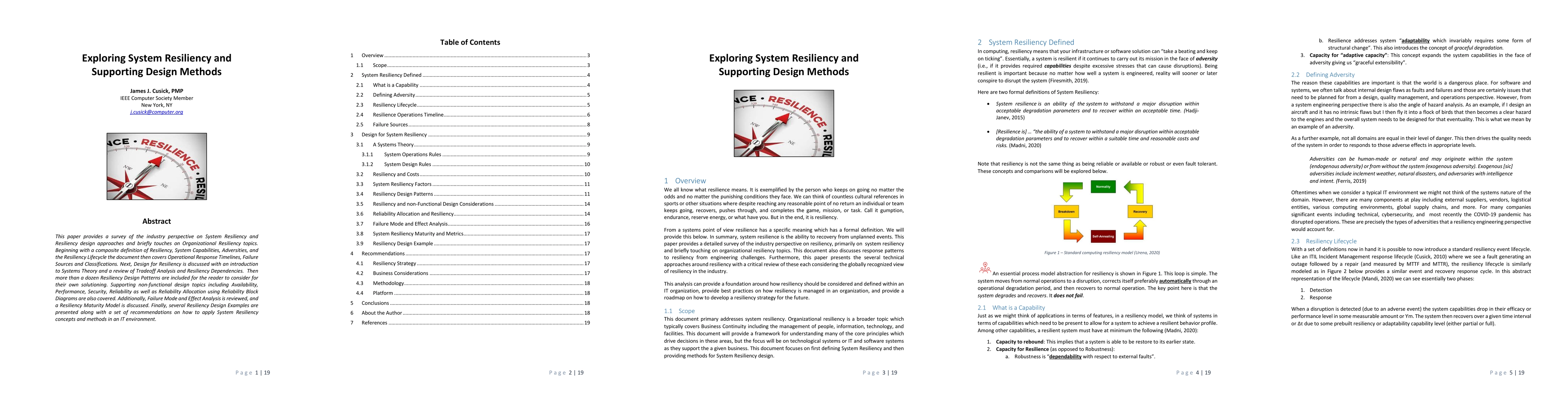 This paper provides a survey of the industry perspective on System Resiliency and Resiliency design approaches and briefly touches on Organizational Resiliency topics. Beginning with a composite definition of Resiliency, System Capabilities, Adversities, and the Resiliency Life-cycle the document then covers Operational Response Timelines, Failure Sources and Classifications. Next, Design for Resiliency is discussed with an introduction to Systems Theory and a review of Trade-off Analysis and Resiliency Dependencies. Then more than a dozen Resiliency Design Patterns are included for the reader to consider for their own solutioning. Supporting non-functional design topics including Availability, Performance, Security, Reliability as well as Reliability Allocation using Reliability Block Diagrams are also covered. Additionally, Failure Mode and Effect Analysis is reviewed, and a Resiliency Maturity Model is discussed. Finally, several Resiliency Design Examples are presented along with a set of recommendations on how to apply System Resiliency concepts and methods in an IT environment.