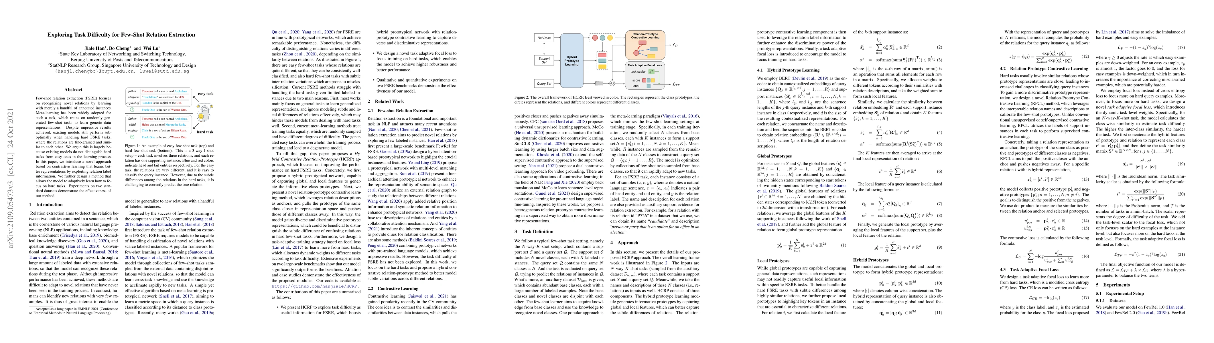 This paper proposes a novel contrastive learning approach for few-shot relation extraction that distinguishes hard tasks from easy ones, improving performance on fine-grained and similar relations. The method adaptively focuses on challenging tasks, demonstrating effectiveness on standard datasets.