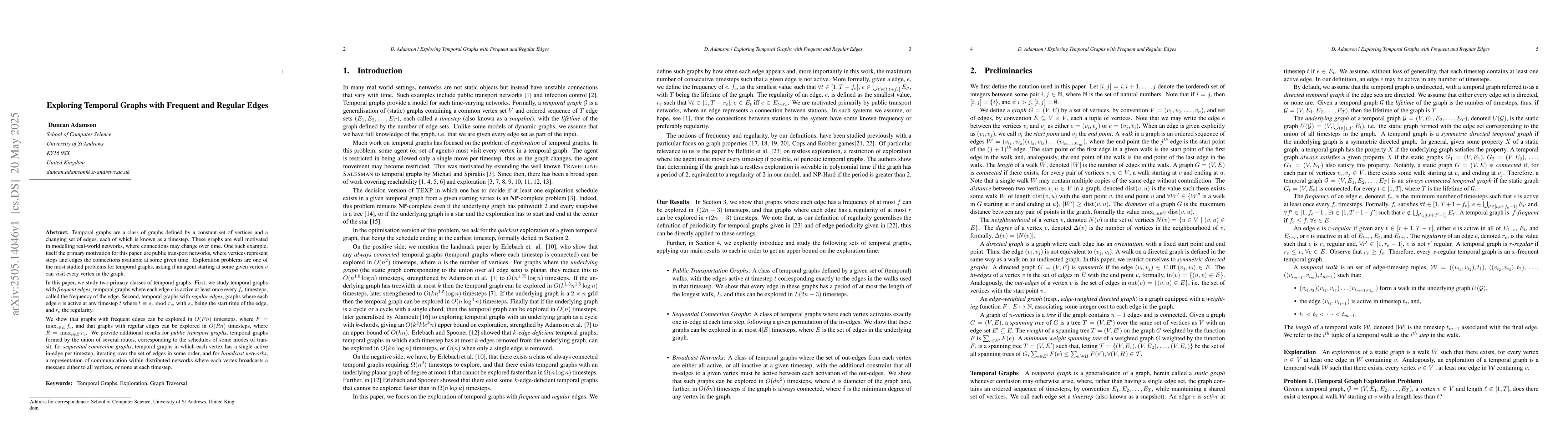 This paper explores two types of temporal graphs: those with frequent edges that appear at least once every f timesteps, and regular edges active at specific timesteps based on a start time and regularity, offering efficient exploration algorithms for each type.