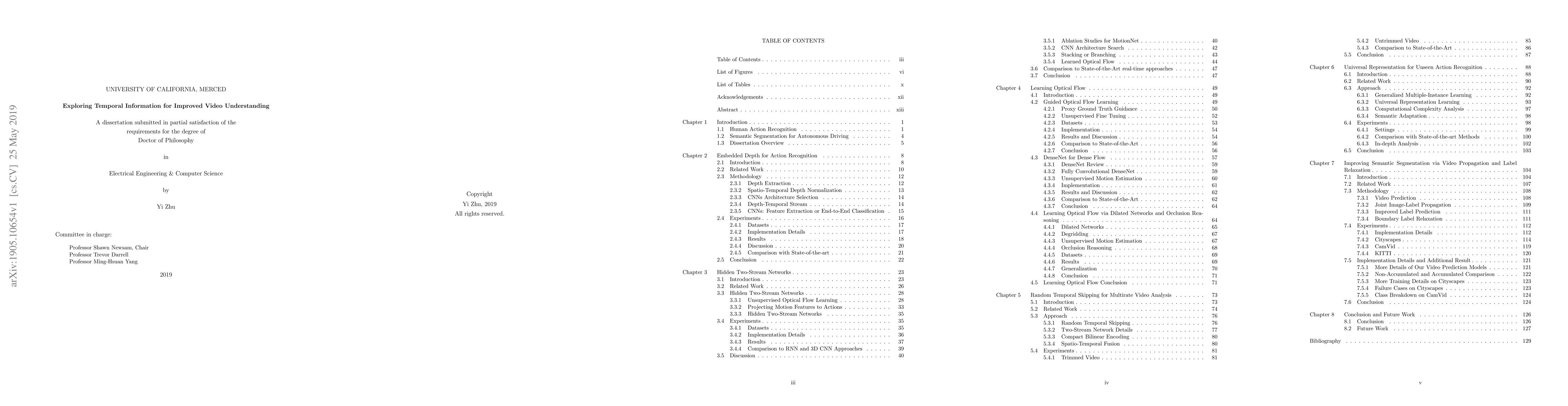 In this dissertation, I present my work towards exploring temporal information for better video understanding. Specifically, I have worked on two problems: action recognition and semantic segmentation. For action recognition, I have proposed a framework, termed hidden two-stream networks, to learn an optimal motion representation that does not require the computation of optical flow. My framework alleviates several challenges faced in video classification, such as learning motion representations, real-time inference, multi-framerate handling, generalizability to unseen actions, etc. For semantic segmentation, I have introduced a general framework that uses video prediction models to synthesize new training samples. By scaling up the training dataset, my trained models are more accurate and robust than previous models even without modifications to the network architectures or objective functions. I believe videos have much more potential to be mined, and temporal information is one of the most important cues for machines to perceive the visual world better.
