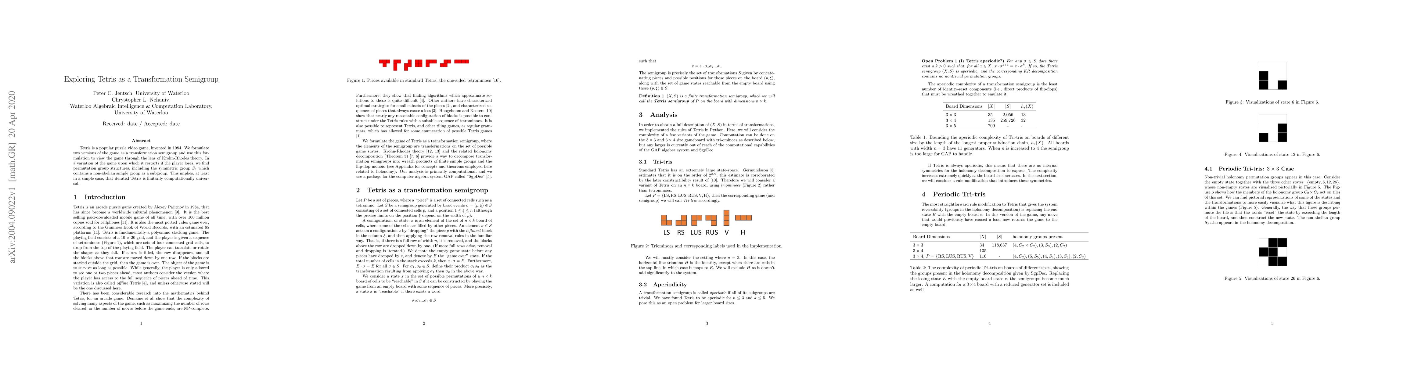 Tetris is a popular puzzle video game, invented in 1984. We formulate two versions of the game as a transformation semigroup and use this formulation to view the game through the lens of Krohn-Rhodes theory. In a variation of the game upon which it restarts if the player loses, we find permutation group structures, including the symmetric group $S_5$ which contains a non-abelian simple group as a subgroup. This implies, at least in a simple case, that iterated Tetris is finitarily computationally universal.