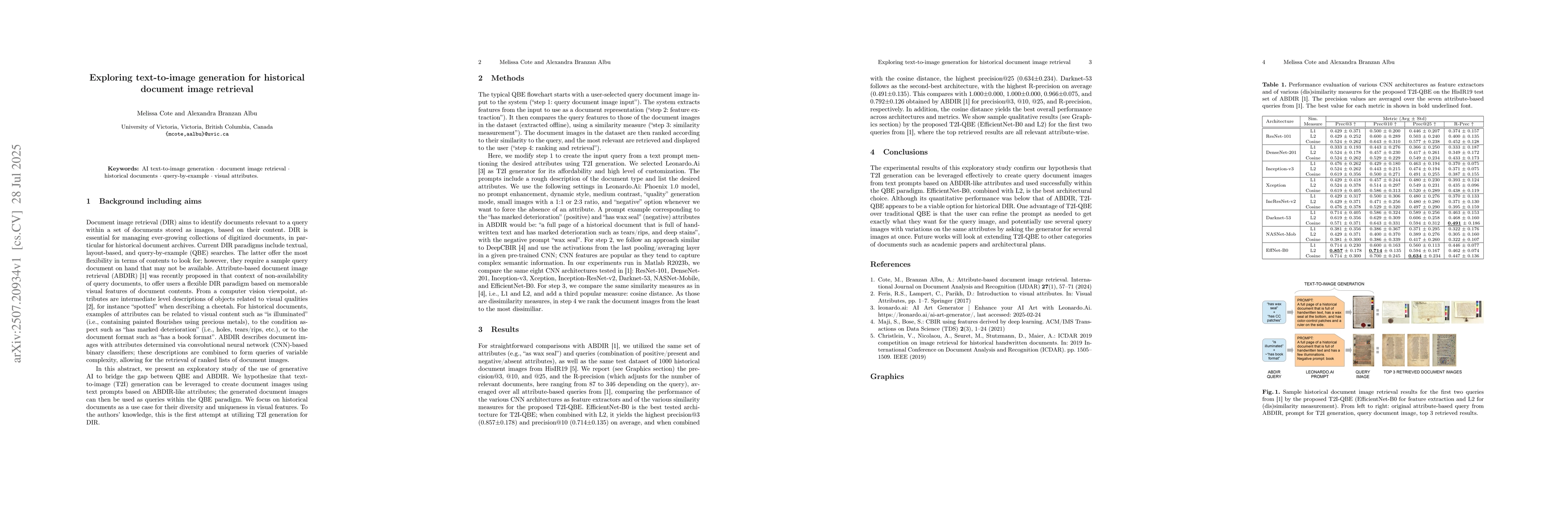 This research demonstrates the viability of T2I-QBE for historical document image retrieval, offering a flexible way to create query document images using text prompts based on ABDIR-like attributes, which is particularly useful when sample query documents are unavailable.