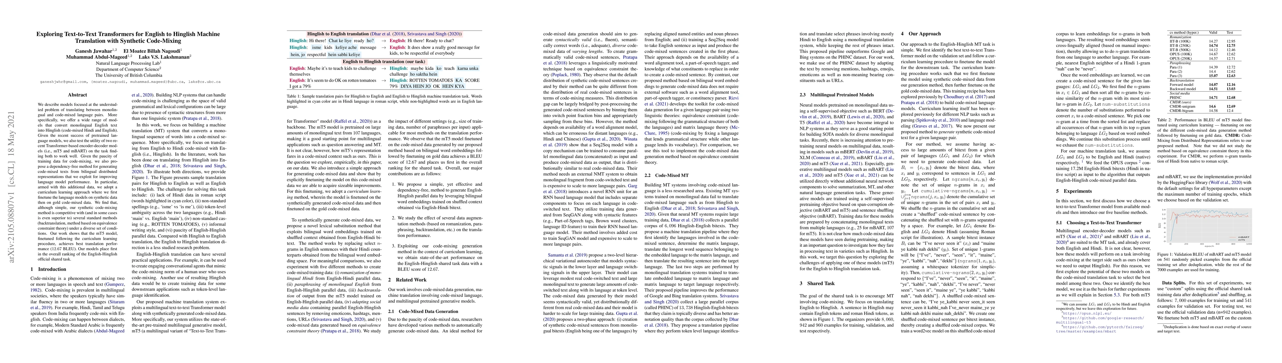 We describe models focused at the understudied problem of translating between monolingual and code-mixed language pairs. More specifically, we offer a wide range of models that convert monolingual English text into Hinglish (code-mixed Hindi and English). Given the recent success of pretrained language models, we also test the utility of two recent Transformer-based encoder-decoder models (i.e., mT5 and mBART) on the task finding both to work well. Given the paucity of training data for code-mixing, we also propose a dependency-free method for generating code-mixed texts from bilingual distributed representations that we exploit for improving language model performance. In particular, armed with this additional data, we adopt a curriculum learning approach where we first finetune the language models on synthetic data then on gold code-mixed data. We find that, although simple, our synthetic code-mixing method is competitive with (and in some cases is even superior to) several standard methods (backtranslation, method based on equivalence constraint theory) under a diverse set of conditions. Our work shows that the mT5 model, finetuned following the curriculum learning procedure, achieves best translation performance (12.67 BLEU). Our models place first in the overall ranking of the English-Hinglish official shared task.