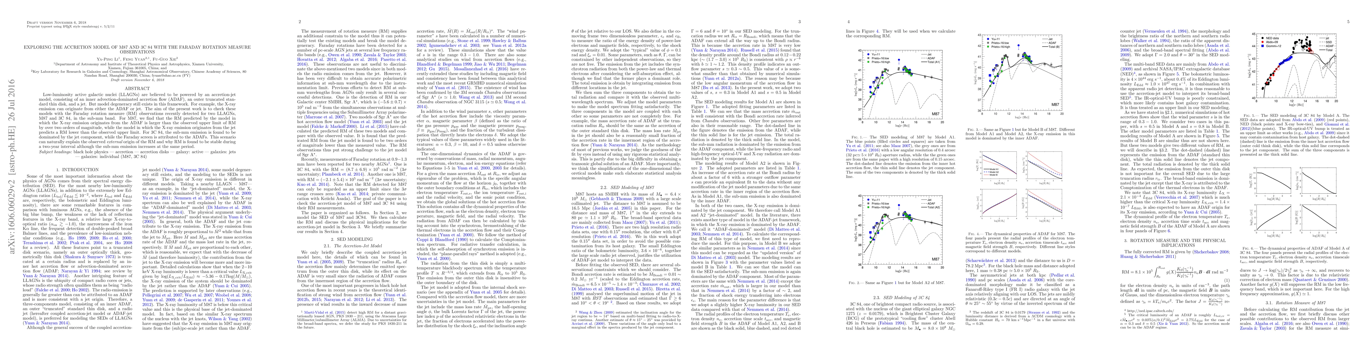 This paper examines the accretion model for low-luminosity active galactic nuclei (LLAGNs) M87 and 3C 84 using Faraday rotation measure (RM) observations. It finds that the RM model predicting X-ray emission from the jet fits M87's data better, while for 3C 84, the jet dominates sub-mm emission and the Faraday screen is attributed to the ADAF.