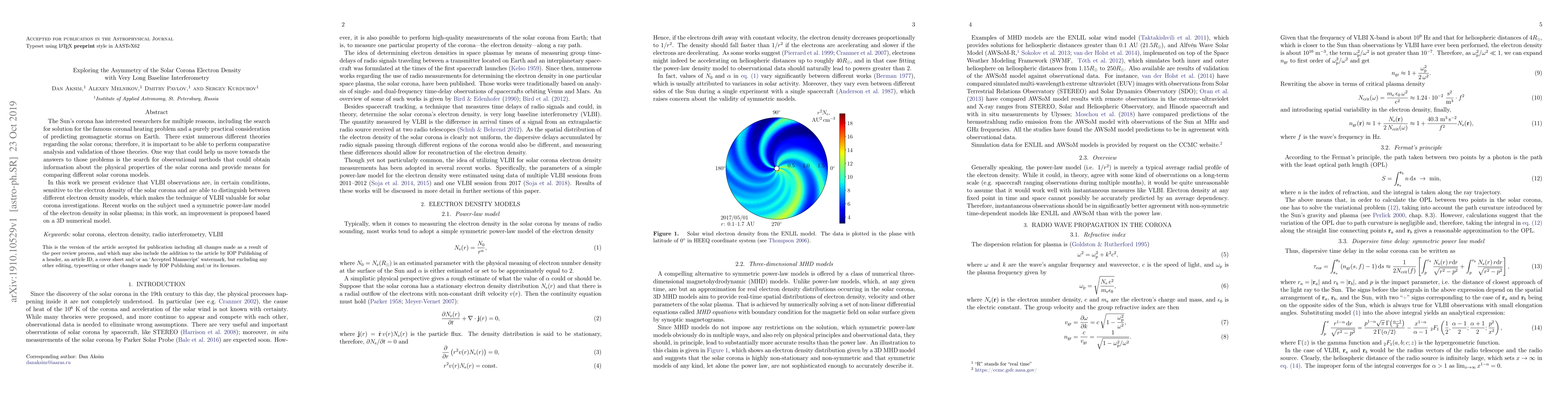 This paper investigates the asymmetry of the solar corona's electron density using Very Long Baseline Interferometry (VLBI) and demonstrates that VLBI can distinguish between different electron density models, offering a valuable observational method for solar corona research. The study proposes an improved 3D numerical model over previous symmetric power-law models.