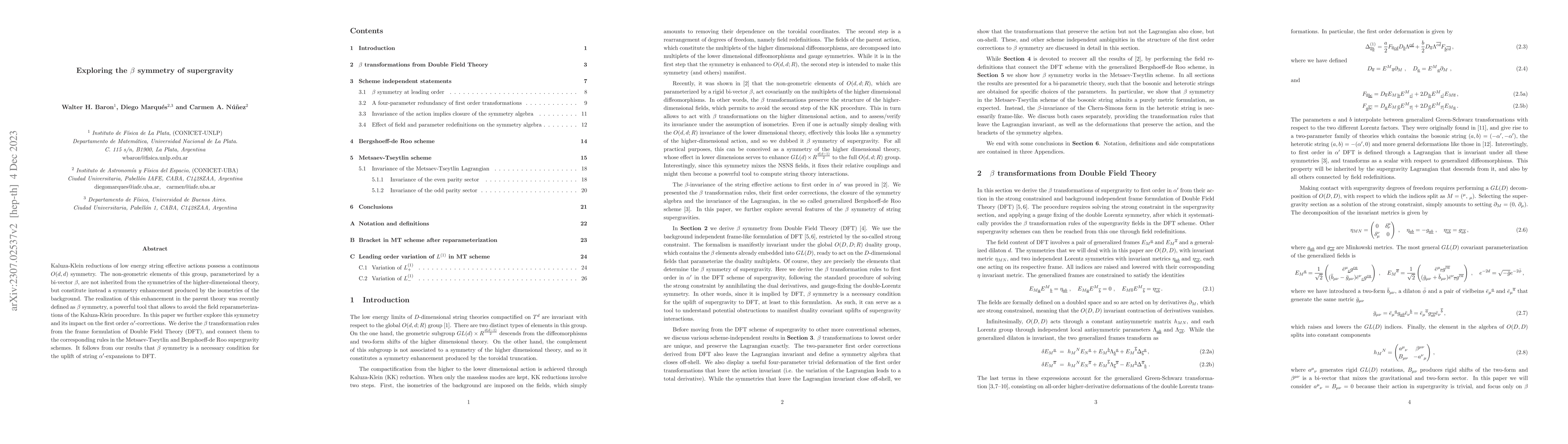 This paper investigates the $\beta$ symmetry in supergravity, revealing its enhancement from isometries in the background and its necessity for the uplift of string $\alpha'$-expansions to Double Field Theory. The $\beta$ transformation rules are derived from the frame formulation of DFT and connected to Metsaev-Tseytlin and Bergshoeff-de Roo schemes.