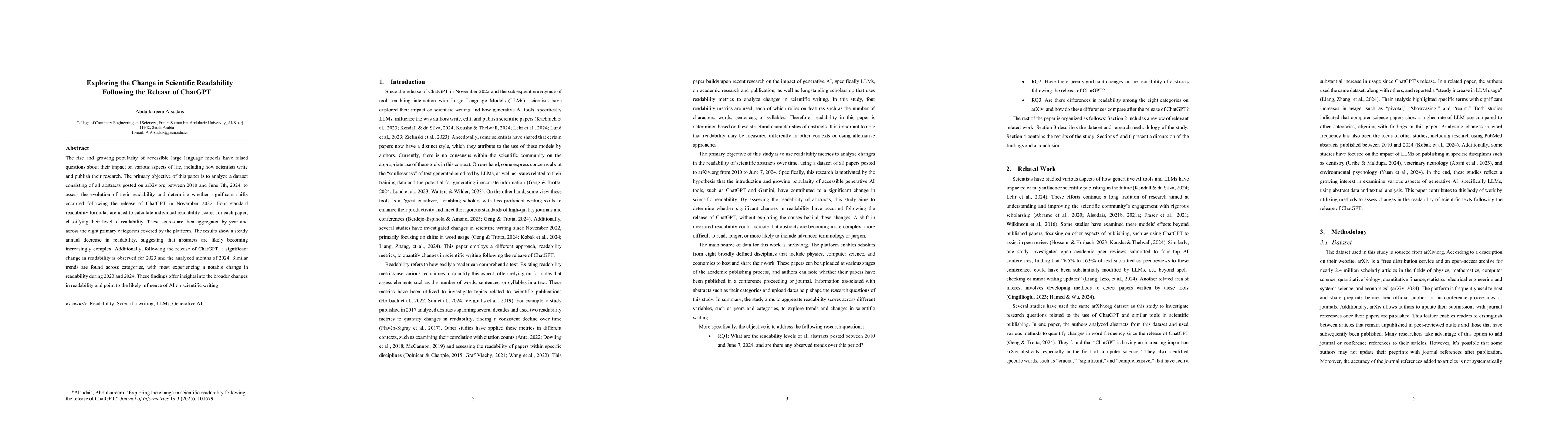 The rise and growing popularity of accessible large language models have raised questions about their impact on various aspects of life, including how scientists write and publish their research. The primary objective of this paper is to analyze a dataset consisting of all abstracts posted on arXiv.org between 2010 and June 7th, 2024, to assess the evolution of their readability and determine whether significant shifts occurred following the release of ChatGPT in November 2022. Four standard readability formulas are used to calculate individual readability scores for each paper, classifying their level of readability. These scores are then aggregated by year and across the eight primary categories covered by the platform. The results show a steady annual decrease in readability, suggesting that abstracts are likely becoming increasingly complex. Additionally, following the release of ChatGPT, a significant change in readability is observed for 2023 and the analyzed months of 2024. Similar trends are found across categories, with most experiencing a notable change in readability during 2023 and 2024. These findings offer insights into the broader changes in readability and point to the likely influence of AI on scientific writing.