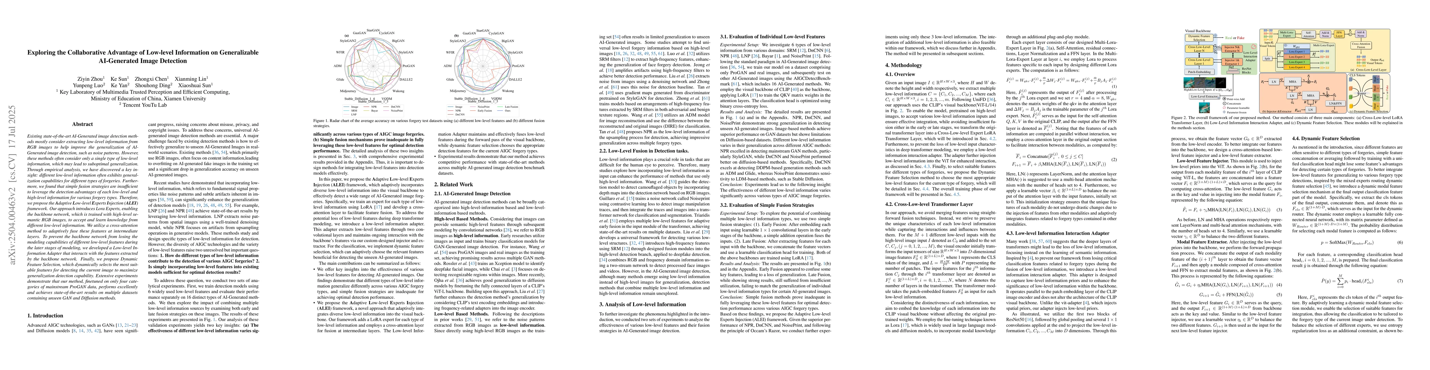 Existing state-of-the-art AI-Generated image detection methods mostly consider extracting low-level information from RGB images to help improve the generalization of AI-Generated image detection, such as noise patterns. However, these methods often consider only a single type of low-level information, which may lead to suboptimal generalization. Through empirical analysis, we have discovered a key insight: different low-level information often exhibits generalization capabilities for different types of forgeries. Furthermore, we found that simple fusion strategies are insufficient to leverage the detection advantages of each low-level and high-level information for various forgery types. Therefore, we propose the Adaptive Low-level Experts Injection (ALEI) framework. Our approach introduces Lora Experts, enabling the backbone network, which is trained with high-level semantic RGB images, to accept and learn knowledge from different low-level information. We utilize a cross-attention method to adaptively fuse these features at intermediate layers. To prevent the backbone network from losing the modeling capabilities of different low-level features during the later stages of modeling, we developed a Low-level Information Adapter that interacts with the features extracted by the backbone network. Finally, we propose Dynamic Feature Selection, which dynamically selects the most suitable features for detecting the current image to maximize generalization detection capability. Extensive experiments demonstrate that our method, finetuned on only four categories of mainstream ProGAN data, performs excellently and achieves state-of-the-art results on multiple datasets containing unseen GAN and Diffusion methods.