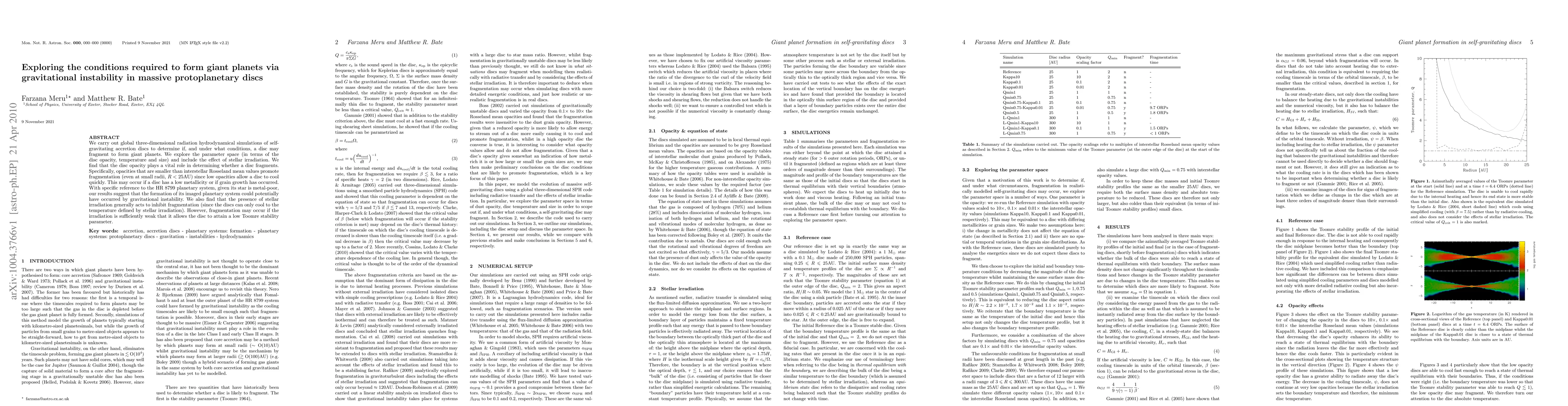 We carry out global three-dimensional radiation hydrodynamical simulations of self-gravitating accretion discs to determine if, and under what conditions, a disc may fragment to form giant planets. We explore the parameter space (in terms of the disc opacity, temperature and size) and include the effect of stellar irradiation. We find that the disc opacity plays a vital role in determining whether a disc fragments. Specifically, opacities that are smaller than interstellar Rosseland mean values promote fragmentation (even at small radii, R < 25AU) since low opacities allow a disc to cool quickly. This may occur if a disc has a low metallicity or if grain growth has occurred. With specific reference to the HR 8799 planetary system, given its star is metal-poor, our results suggest that the formation of its imaged planetary system could potentially have occurred by gravitational instability. We also find that the presence of stellar irradiation generally acts to inhibit fragmentation (since the discs can only cool to the temperature defined by stellar irradiation). However, fragmentation may occur if the irradiation is sufficiently weak that it allows the disc to attain a low Toomre stability parameter.