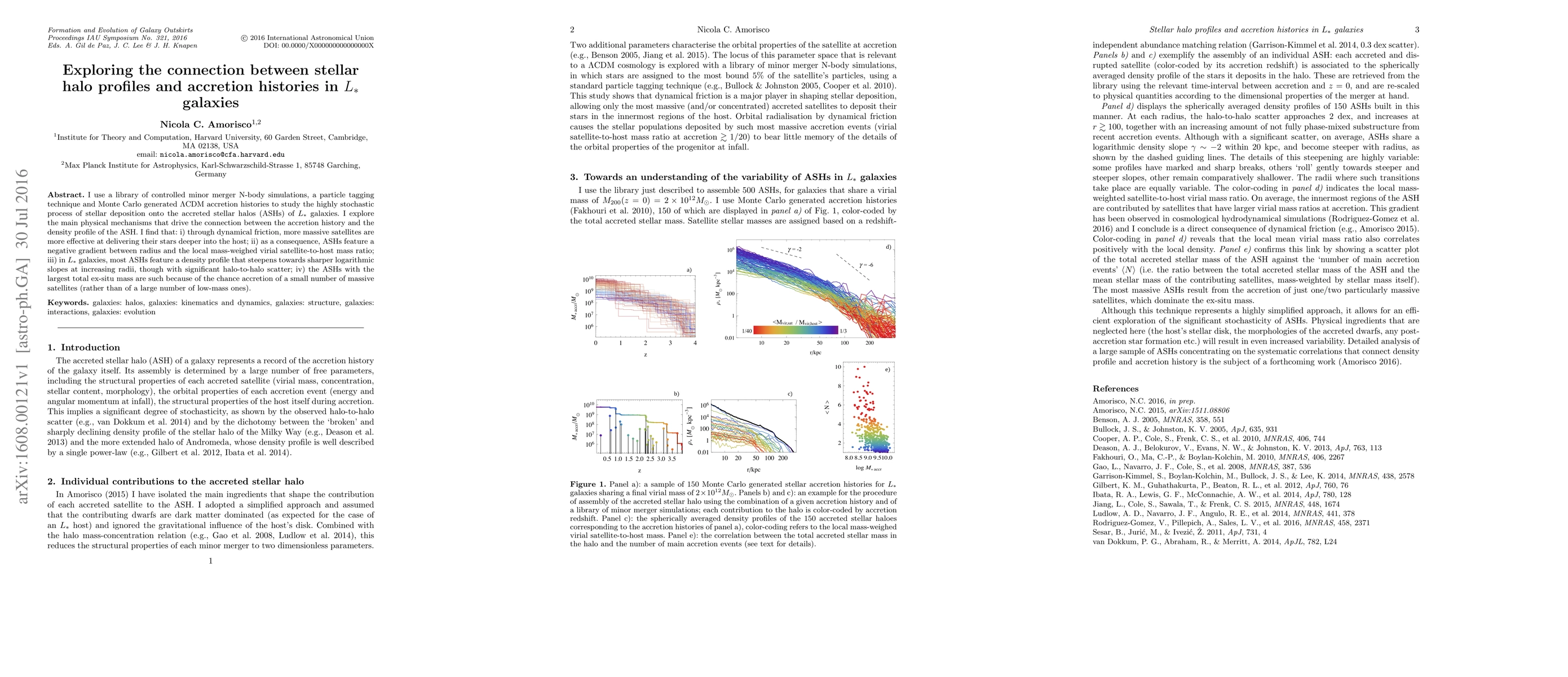 This paper investigates the relationship between stellar halo profiles and accretion histories in $L_*$ galaxies using N-body simulations and Monte Carlo methods. It finds that massive satellites effectively deposit stars deeper into the host via dynamical friction, leading to ASHs with steepening density profiles and significant scatter.