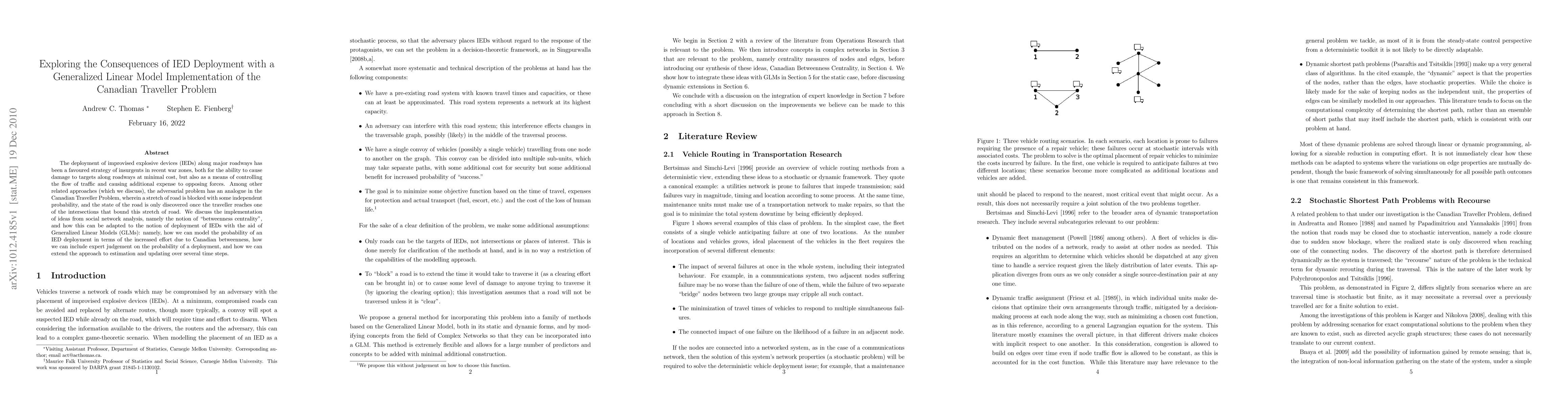 The deployment of improvised explosive devices (IEDs) along major roadways has been a favoured strategy of insurgents in recent war zones, both for the ability to cause damage to targets along roadways at minimal cost, but also as a means of controlling the flow of traffic and causing additional expense to opposing forces. Among other related approaches (which we discuss), the adversarial problem has an analogue in the Canadian Traveller Problem, wherein a stretch of road is blocked with some independent probability, and the state of the road is only discovered once the traveller reaches one of the intersections that bound this stretch of road. We discuss the implementation of ideas from social network analysis, namely the notion of "betweenness centrality", and how this can be adapted to the notion of deployment of IEDs with the aid of Generalized Linear Models (GLMs): namely, how we can model the probability of an IED deployment in terms of the increased effort due to Canadian betweenness, how we can include expert judgement on the probability of a deployment, and how we can extend the approach to estimation and updating over several time steps.