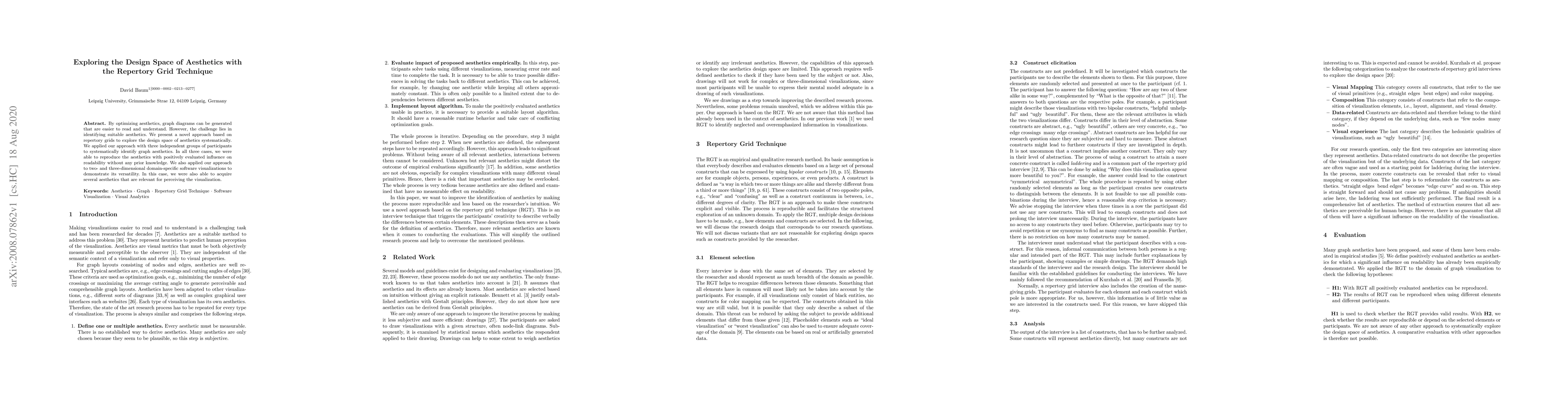 By optimizing aesthetics, graph diagrams can be generated that are easier to read and understand. However, the challenge lies in identifying suitable aesthetics. We present a novel approach based on repertory grids to explore the design space of aesthetics systematically. We applied our approach with three independent groups of participants to systematically identify graph aesthetics. In all three cases, we were able to reproduce the aesthetics with positively evaluated influence on readability without any prior knowledge. We also applied our approach to two- and three-dimensional domain-specific software visualizations to demonstrate its versatility. In this case, we were also able to acquire several aesthetics that are relevant for perceiving the visualization.