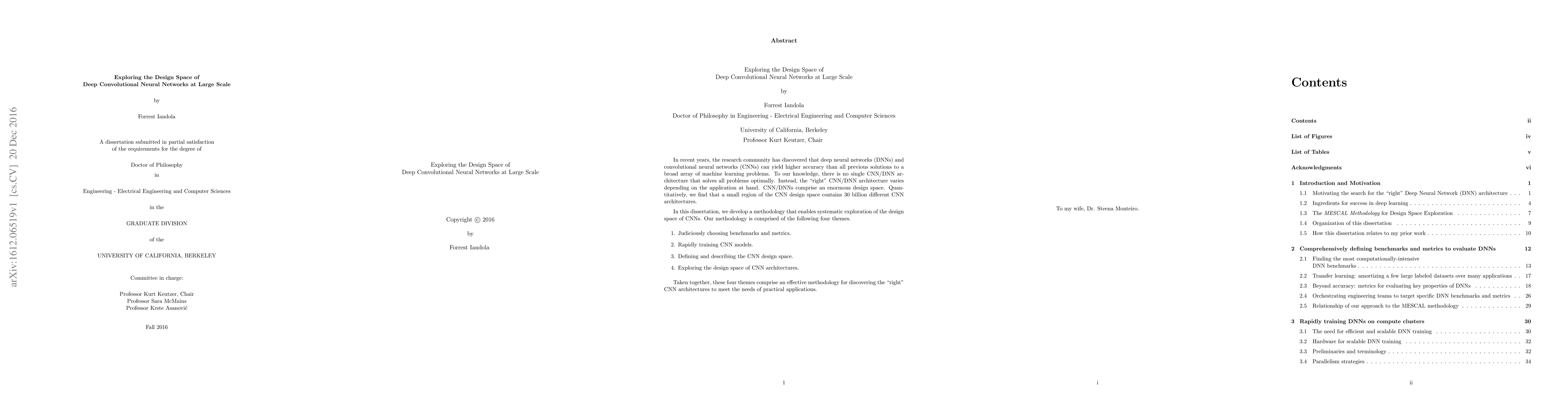 In recent years, the research community has discovered that deep neural networks (DNNs) and convolutional neural networks (CNNs) can yield higher accuracy than all previous solutions to a broad array of machine learning problems. To our knowledge, there is no single CNN/DNN architecture that solves all problems optimally. Instead, the "right" CNN/DNN architecture varies depending on the application at hand. CNN/DNNs comprise an enormous design space. Quantitatively, we find that a small region of the CNN design space contains 30 billion different CNN architectures. In this dissertation, we develop a methodology that enables systematic exploration of the design space of CNNs. Our methodology is comprised of the following four themes. 1. Judiciously choosing benchmarks and metrics. 2. Rapidly training CNN models. 3. Defining and describing the CNN design space. 4. Exploring the design space of CNN architectures. Taken together, these four themes comprise an effective methodology for discovering the "right" CNN architectures to meet the needs of practical applications.