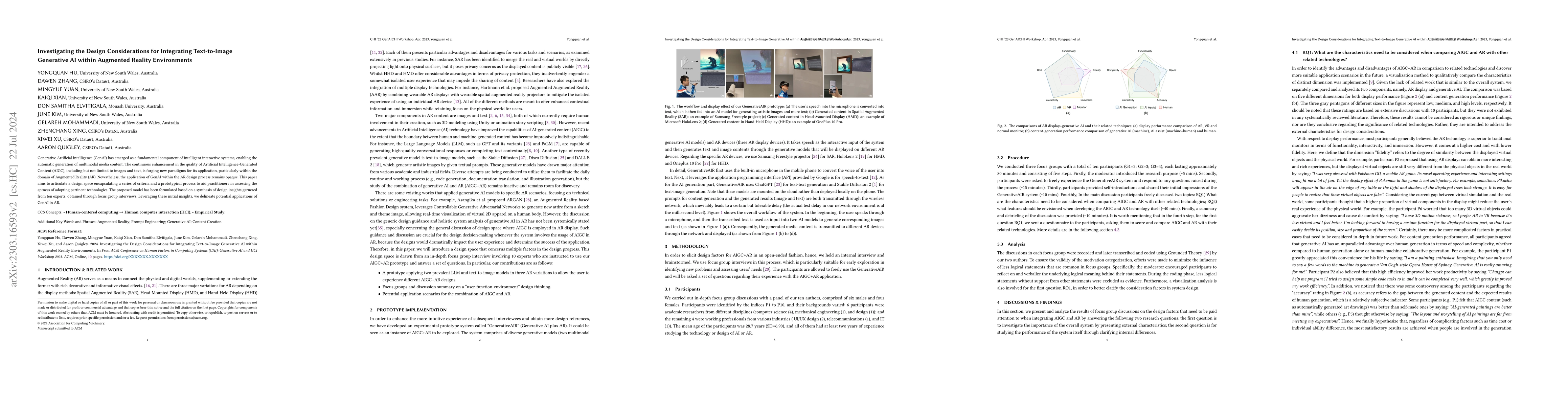 This paper explores the integration of AI-generated content into Augmented Reality (AR) displays, proposing a "user-function-environment" design framework through a prototype and focus group study. It identifies the design space and potential applications for combining AI-generated images and text with AR.