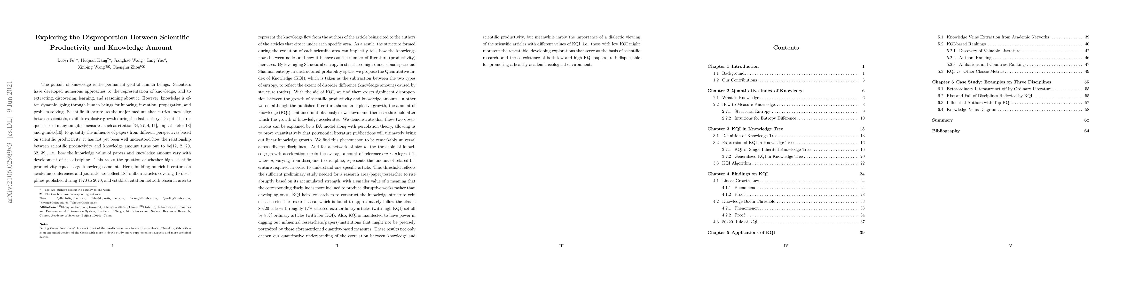 The pursuit of knowledge is the permanent goal of human beings. Scientific literature, as the major medium that carries knowledge between scientists, exhibits explosive growth during the last century. Despite the frequent use of many tangible measures, such as citation, impact factor and g-index, to quantify the influence of papers from different perspectives based on scientific productivity, it has not yet been well understood how the relationship between scientific productivity and knowledge amount turns out to be, i.e., how the knowledge value of papers and knowledge amount vary with development of the discipline. This raises the question of whether high scientific productivity equals large knowledge amount. Here, building on rich literature on academic conferences and journals, we collect 185 million articles covering 19 disciplines published during 1970 to 2020, and establish citation network research area to represent the knowledge flow from the authors of the article being cited to the authors of the articles that cite it under each specific area. As a result, the structure formed during the evolution of each scientific area can implicitly tells how the knowledge flows between nodes and how it behaves as the number of literature (productivity) increases. By leveraging Structural entropy in structured high-dimensional space and Shannon entropy in unstructured probability space, we propose the Quantitative Index of Knowledge (KQI), which is taken as the subtraction between the two types of entropy, to reflect the extent of disorder difference (knowledge amount) caused by structure (order). With the aid of KQI, we find that, although the published literature shows an explosive growth, the amount of knowledge (KQI) contained in it obviously slows down, and there is a threshold after which the growth of knowledge accelerates...