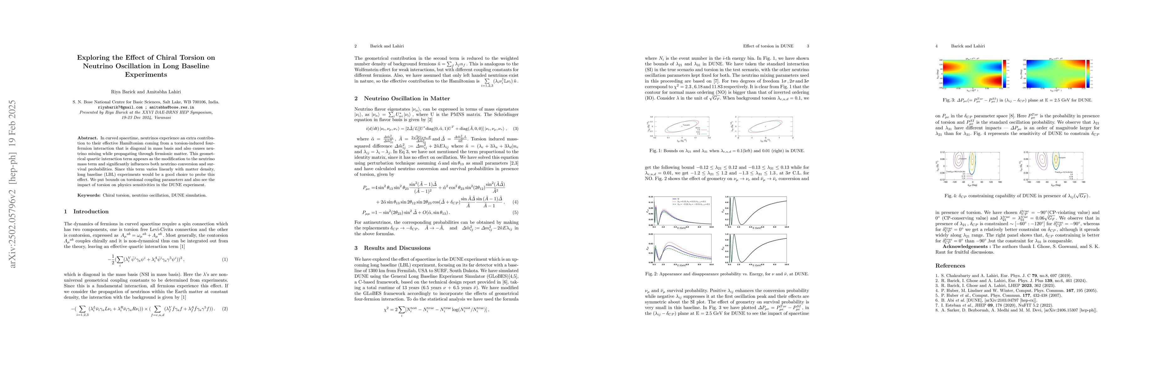 The paper introduces a modified GLoBES framework to simulate neutrino oscillations in curved spacetime, incorporating torsion-induced four-fermion interactions and their effects on neutrino conversion and survival probabilities.