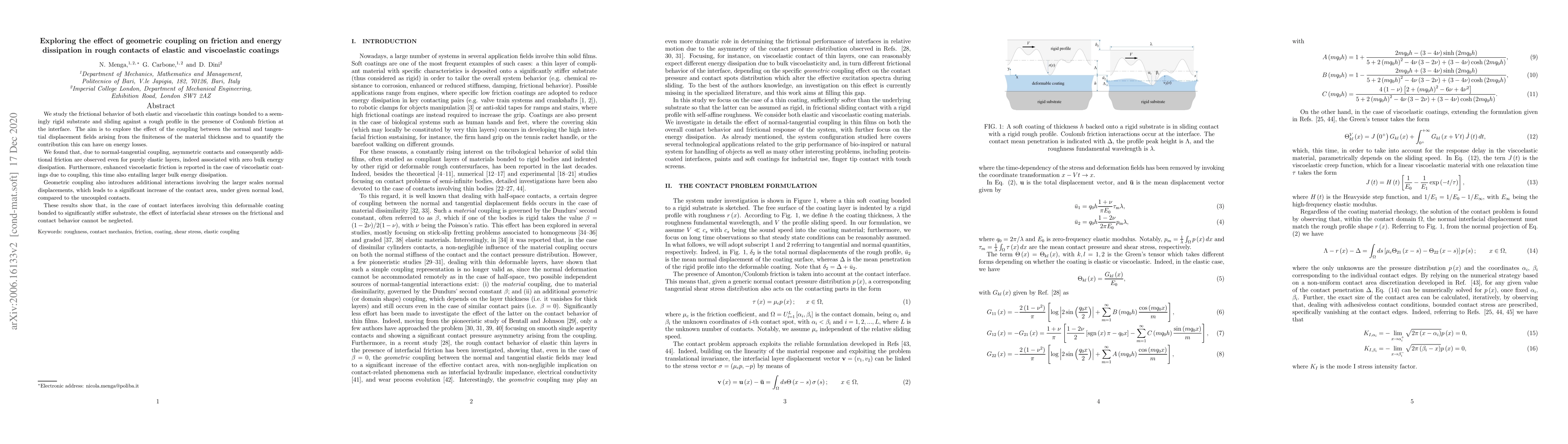 This study investigates how geometric coupling between normal and tangential displacement fields affects friction and energy dissipation in rough contacts of elastic and viscoelastic coatings. It finds that coupling leads to asymmetric contacts, additional friction, and increased energy dissipation, especially in viscoelastic coatings, highlighting the importance of interfacial shear stresses in deformable coatings.
