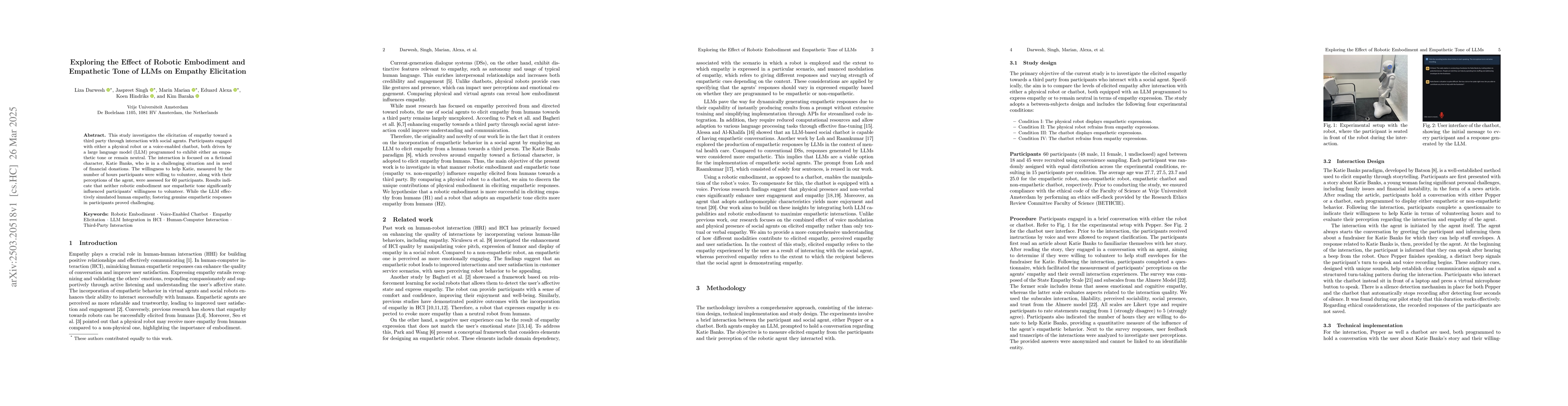 This study employed a between-subjects design with 60 participants interacting with either a physical robot or a voice-enabled chatbot, both driven by a large language model (LLM) programmed to exhibit empathetic or neutral tones. The interaction focused on a fictional character, Katie Banks, in need of financial donations, with participants' willingness to volunteer measured.