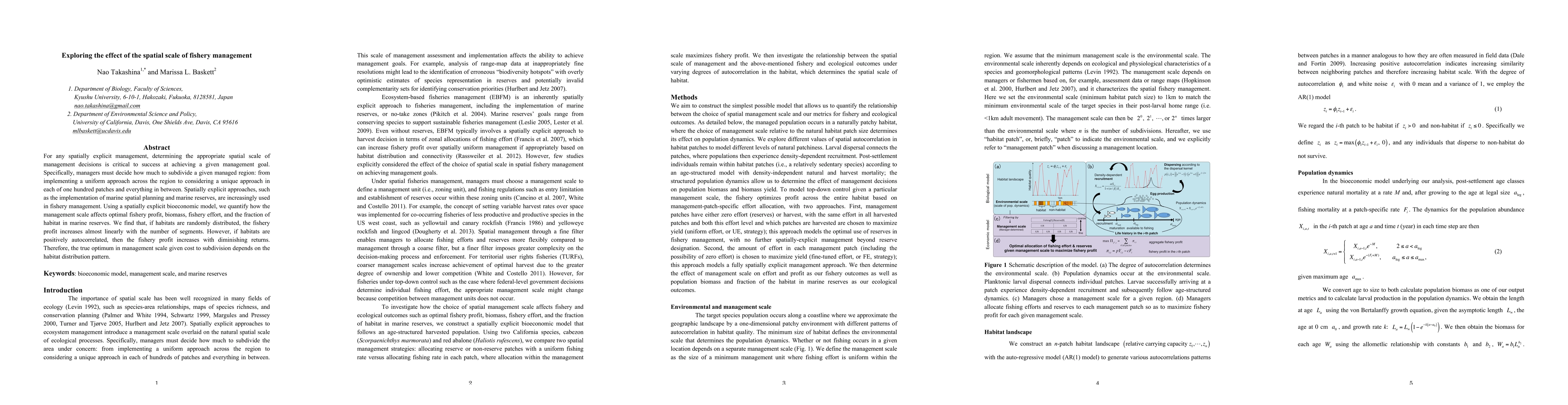 This paper investigates how the spatial scale of fishery management affects optimal profit, biomass, and reserve allocation using a bioeconomic model. It finds that while more subdivisions generally increase profit, the benefit diminishes when habitats are autocorrelated, highlighting the importance of habitat distribution in determining the optimal management scale.