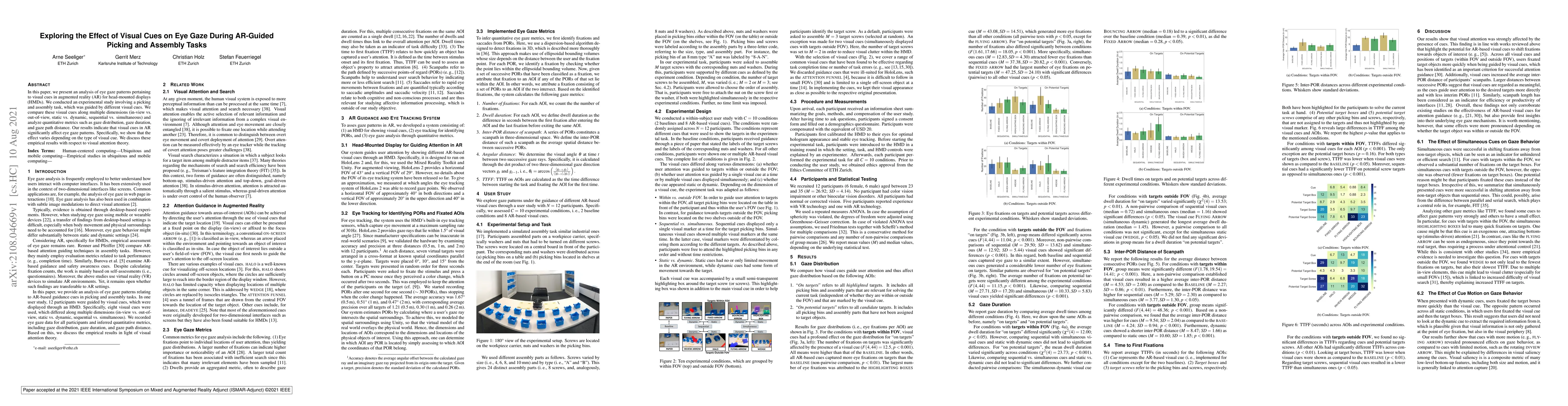 This paper analyzes how different visual cues in augmented reality (AR) affect eye gaze patterns during head-mounted display-guided picking and assembly tasks. The study finds that the type of visual cue (in-view vs. out-of-view, static vs. dynamic, sequential vs. simultaneous) significantly influences gaze distribution, duration, and path distance, with implications for visual attention theory.