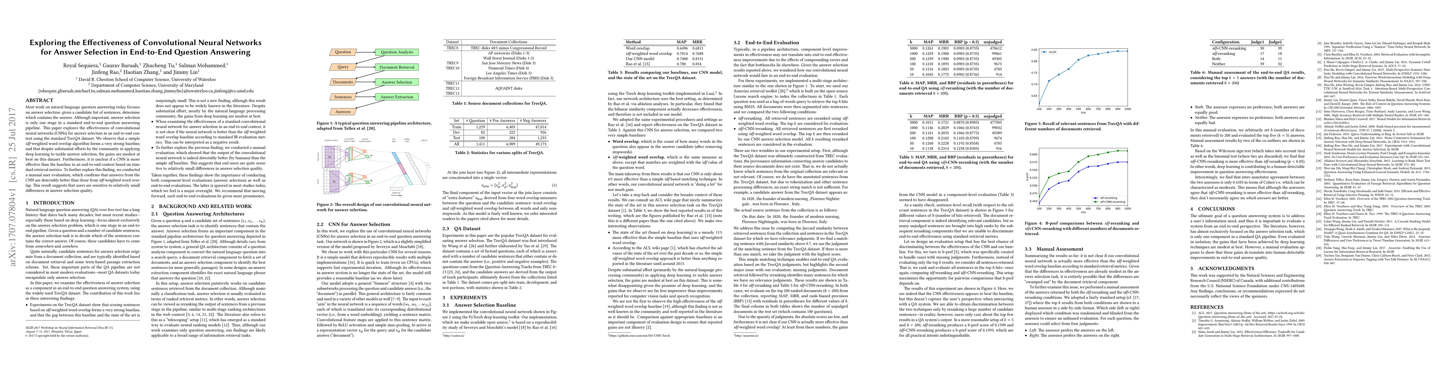 This paper investigates the use of convolutional neural networks (CNNs) for answer selection in end-to-end question answering systems, finding modest gains over a simple baseline despite community efforts. A manual user evaluation confirms CNNs produce detectably better answers, indicating users value subtle improvements in answer quality.