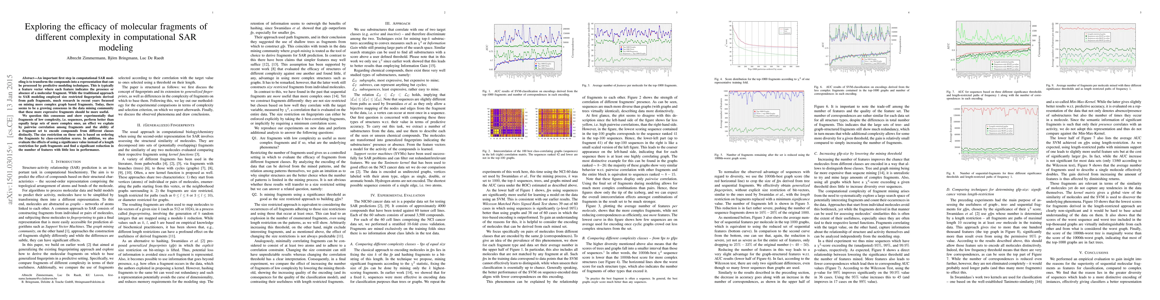 This study challenges the assumption that complex molecular fragments are superior in computational SAR modeling. Experiments show that simpler, lower complexity fragments perform better due to reduced correlation and enhanced class distinctness. The research also suggests using significance value over length for path fragments, significantly reducing features with minimal performance loss.