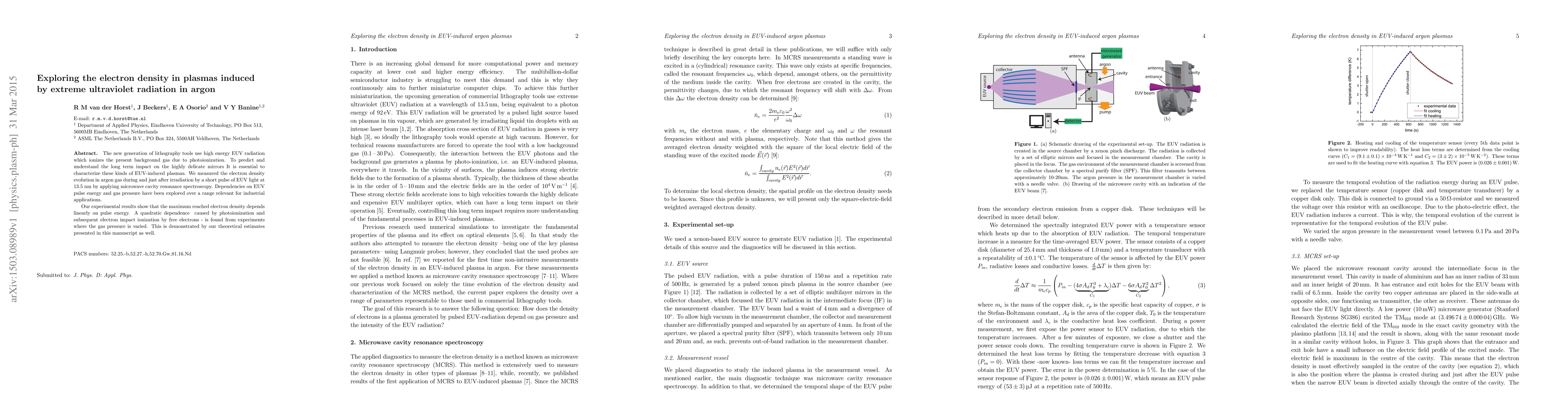 The new generation of lithography tools use high energy EUV radiation which ionizes the present background gas due to photoionization. To predict and understand the long term impact on the highly delicate mirrors It is essential to characterize these kinds of EUV-induced plasmas. We measured the electron density evolution in argon gas during and just after irradiation by a short pulse of EUV light at 13.5 nm by applying microwave cavity resonance spectroscopy. Dependencies on EUV pulse energy and gas pressure have been explored over a range relevant for industrial applications. Our experimental results show that the maximum reached electron density depends linearly on pulse energy. A quadratic dependence - caused by photoionization and subsequent electron impact ionization by free electrons - is found from experiments where the gas pressure is varied. This is demonstrated by our theoretical estimates presented in this manuscript as well.
