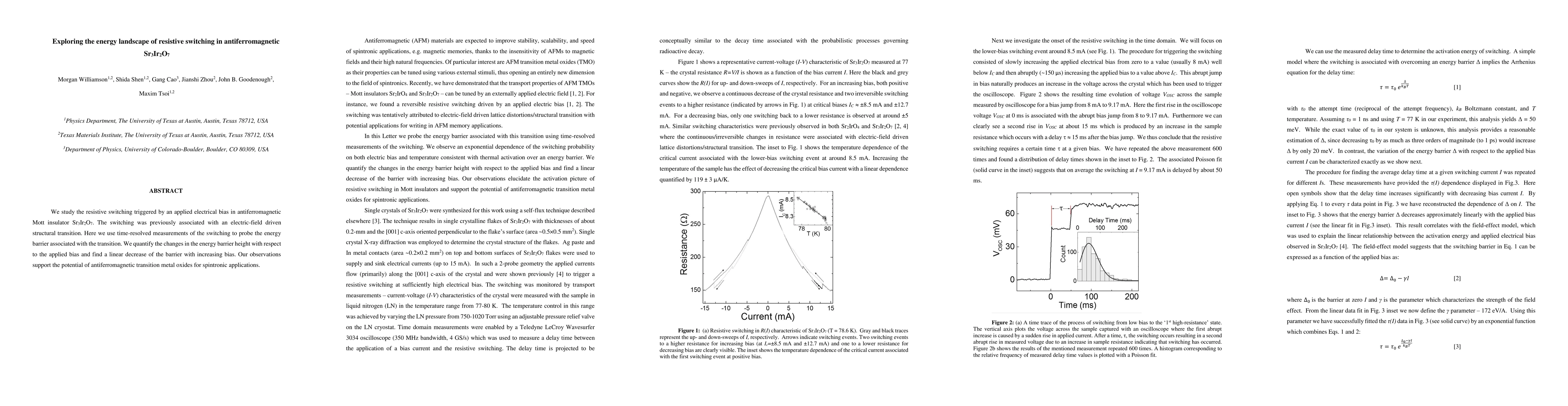 The research investigates resistive switching in the antiferromagnetic material Sr(3)Ir(2)O(7), revealing a linear decrease in energy barrier height with increasing electrical bias. This finding suggests potential for antiferromagnetic transition metal oxides in spintronic applications.