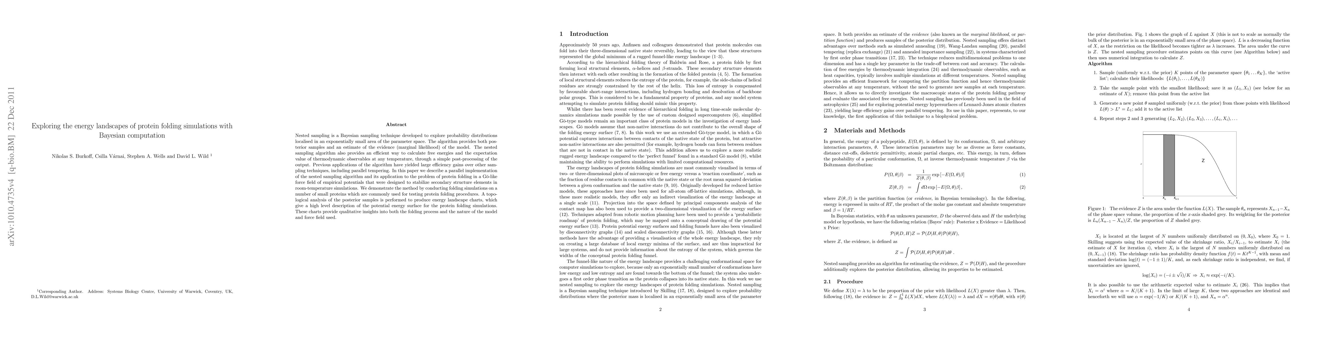 Nested sampling is a Bayesian sampling technique developed to explore probability distributions lo- calised in an exponentially small area of the parameter space. The algorithm provides both posterior samples and an estimate of the evidence (marginal likelihood) of the model. The nested sampling algo- rithm also provides an efficient way to calculate free energies and the expectation value of thermodynamic observables at any temperature, through a simple post-processing of the output. Previous applications of the algorithm have yielded large efficiency gains over other sampling techniques, including parallel tempering (replica exchange). In this paper we describe a parallel implementation of the nested sampling algorithm and its application to the problem of protein folding in a Go-type force field of empirical potentials that were designed to stabilize secondary structure elements in room-temperature simulations. We demonstrate the method by conducting folding simulations on a number of small proteins which are commonly used for testing protein folding procedures: protein G, the SH3 domain of Src tyrosine kinase and chymotrypsin inhibitor 2. A topological analysis of the posterior samples is performed to produce energy landscape charts, which give a high level description of the potential energy surface for the protein folding simulations. These charts provide qualitative insights into both the folding process and the nature of the model and force field used.