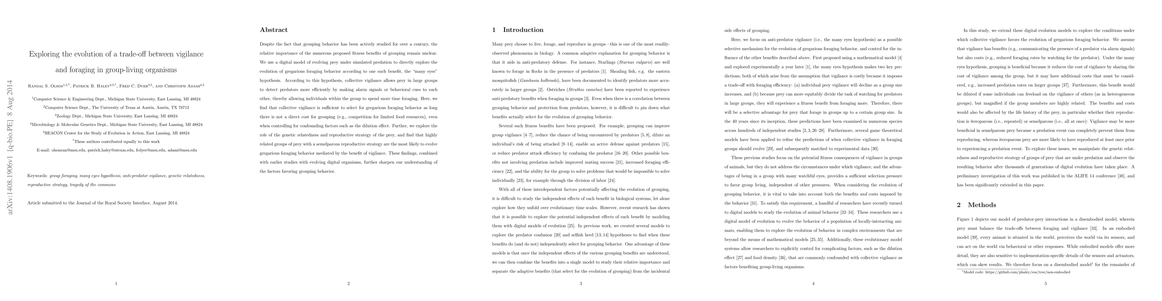 A digital model found that collective vigilance can drive gregarious foraging behavior in group-living organisms as long as there is no direct cost to grouping, without considering factors like competition for resources. Highly related groups with semelparous reproductive strategies are most likely to evolve this behavior.