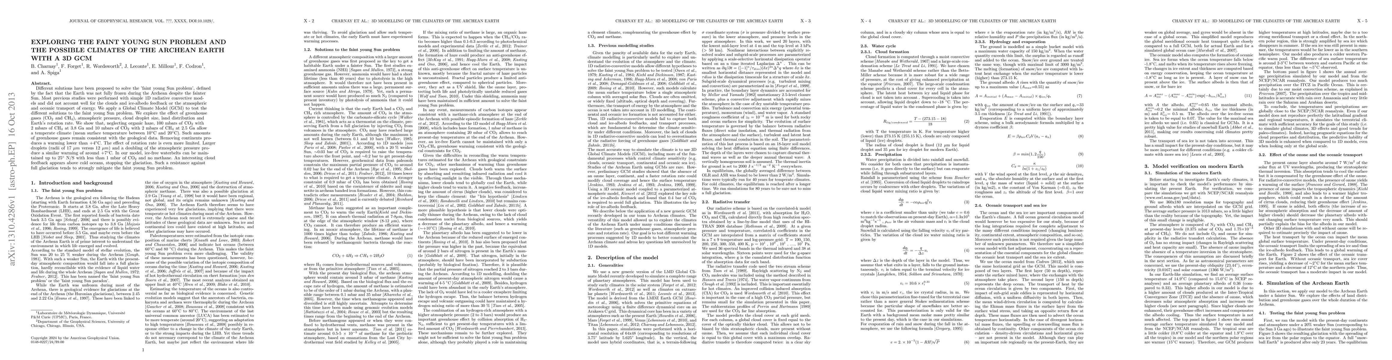 This research uses a 3-D Global Climate Model (GCM) to investigate the 'faint young Sun problem'. It finds that combinations of CO2, CH4, atmospheric pressure, cloud properties, land distribution, and rotation rate can explain Earth's temperate climate during Archean, despite the Sun's lower luminosity. Notably, clouds above cold oceans prevent full glaciation, mitigating the faint young Sun problem.