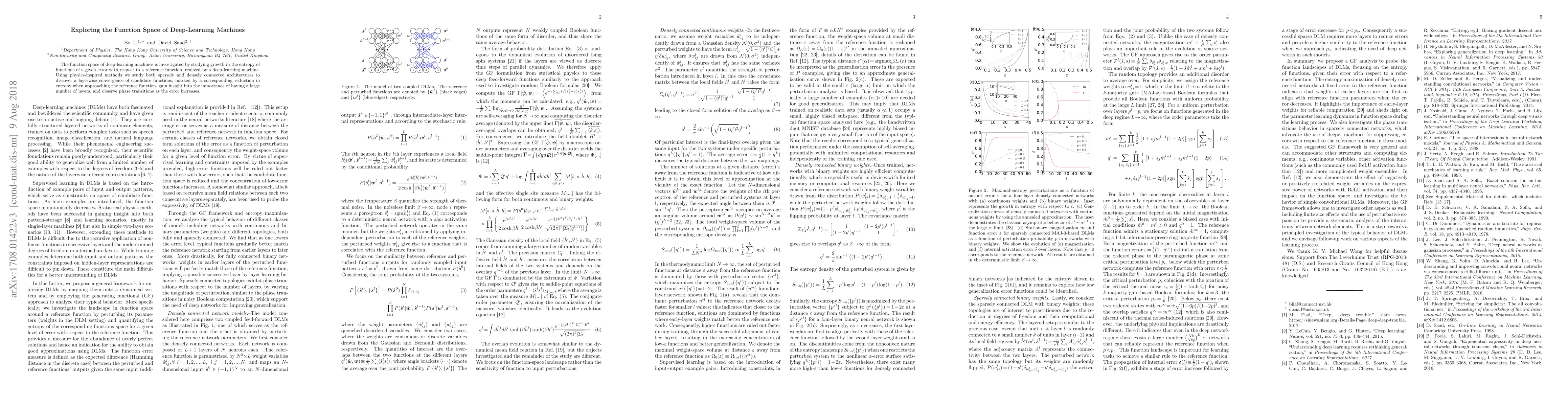 The function space of deep-learning machines is investigated by studying growth in the entropy of functions of a given error with respect to a reference function, realized by a deep-learning machine. Using physics-inspired methods we study both sparsely and densely-connected architectures to discover a layer-wise convergence of candidate functions, marked by a corresponding reduction in entropy when approaching the reference function, gain insight into the importance of having a large number of layers, and observe phase transitions as the error increases.