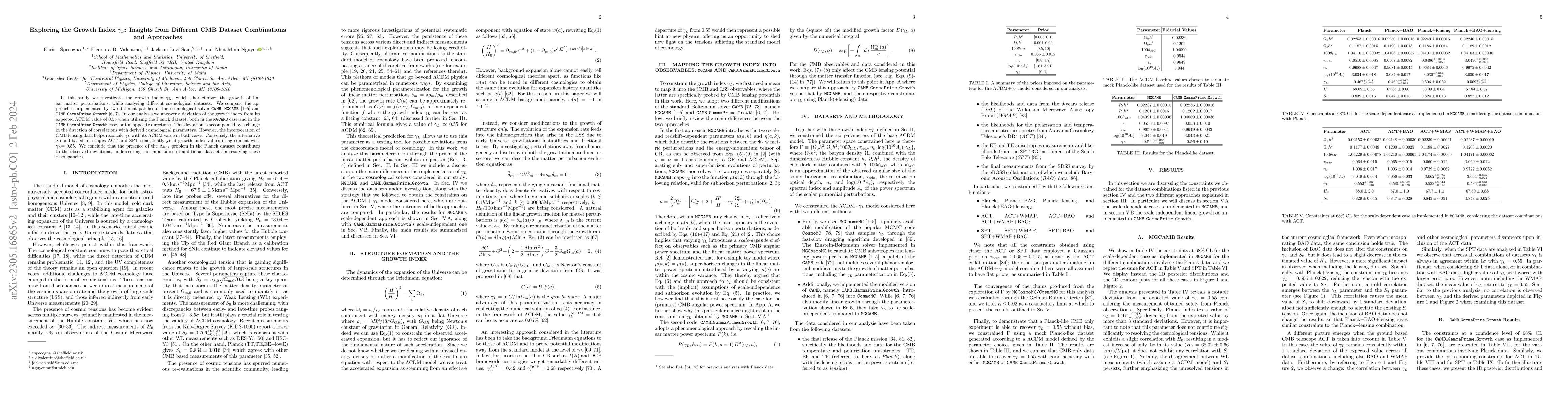 This study investigates the growth index $\gamma_L$ using various cosmological datasets and CAMB solvers, revealing deviations from the $\Lambda$CDM value of $0.55$ in the Planck dataset but not in ACT and SPT data. The inclusion of CMB lensing data reconciles $\gamma_L$ in both CAMB implementations, highlighting the A$_{\mathrm{lens}}$ problem's impact on the Planck dataset.