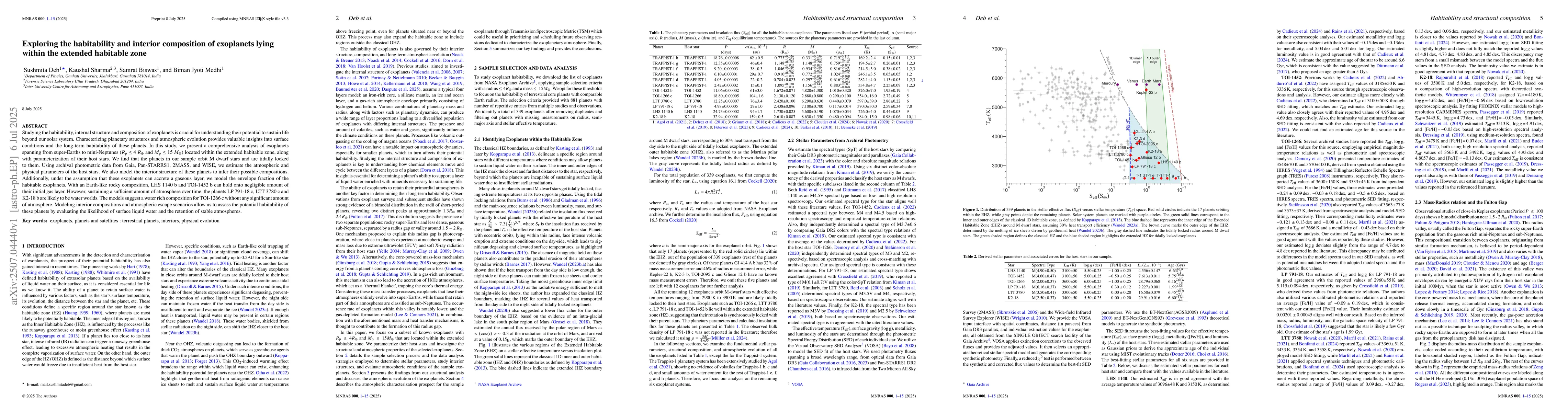Studying the habitability, internal structure and composition of exoplanets is crucial for understanding their potential to sustain life beyond our solar system. Characterizing planetary structures and atmospheric evolution provides valuable insights into surface conditions and the long-term habitability of these planets. In this study, we present a comprehensive analysis of exoplanets spanning from super-Earths to mini-Neptunes ($R_{\textrm{p}}$ $\leq$ 4 $R_{\oplus}$ and $M_{\textrm{p}}$ $\leq$ 15 $M_{\oplus}$) located within the extended habitable zone, along with parameterization of their host stars. We find that the planets in our sample orbit M dwarf stars and are tidally locked to them. Using archival photometric data from Gaia, Pan-STARRS1, 2MASS, and WISE, we estimate the atmospheric and physical parameters of the host stars. We also model the interior structure of these planets to infer their possible compositions. Additionally, under the assumption that these exoplanets can accrete a gaseous layer, we model the envelope fraction of the habitable exoplanets. With an Earth-like rocky composition, LHS 1140 b and TOI-1452 b can hold onto negligible amount of their initial gas layer. However, sustaining a sufficient amount of atmosphere over time, the planets LP 791-18 c, LTT 3780 c and K2-18 b are likely to be water worlds. The models suggest a water rich composition for TOI-1266 c without any significant amount of atmosphere. Modeling interior compositions and atmospheric escape scenarios allow us to assess the potential habitability of these planets by evaluating the likelihood of surface liquid water and the retention of stable atmospheres.