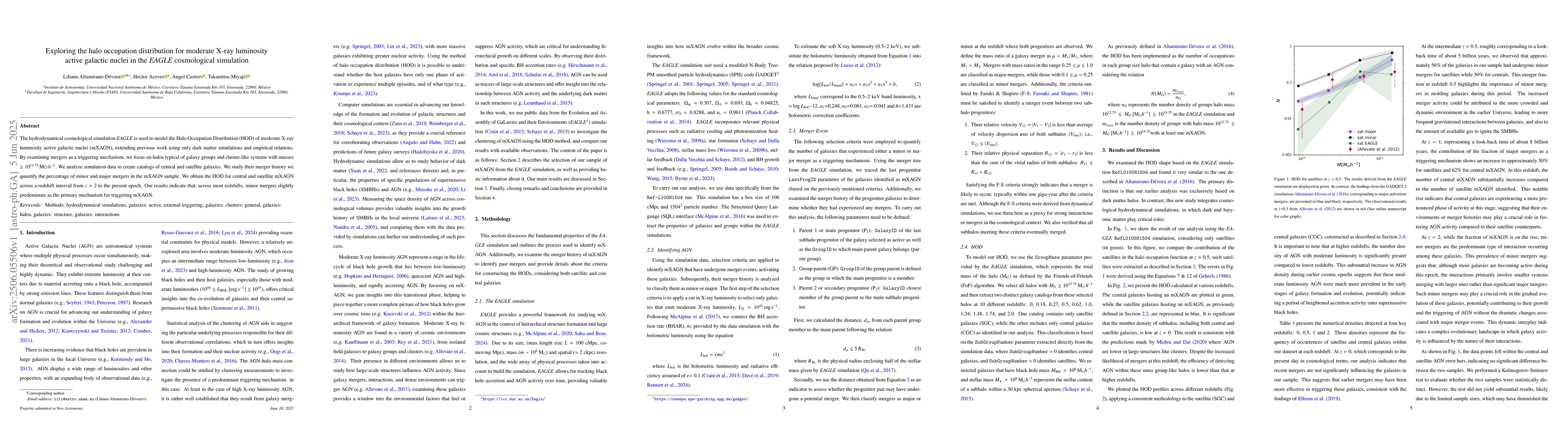 The hydrodynamical cosmological simulation \eagle{} is used to model the Halo Occupation Distribution (HOD) of moderate X-ray luminosity active galactic nuclei (mXAGN), extending previous work using only dark matter simulations and empirical relations. By examining mergers as a triggering mechanism, we focus on halos typical of galaxy groups and cluster-like systems with masses $\geq 10^{12.75}\,{\rm M}{\odot}\,h^{-1}$. We analyze simulation data to create catalogs of central and satellite galaxies. We study their merger history we quantify the percentage of minor and major mergers in the mXAGN sample. We obtain the HOD for central and satellite mXAGN across a redshift interval from \(z=2\) to the present epoch. Our results indicate that, across most redshifts, minor mergers slightly predominate as the primary mechanism for triggering mXAGN.